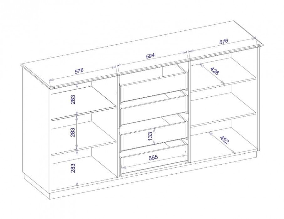 Za krajními dvířky jsou vloženy 2 lakované police a uprostřed jsou 4 zásuvky na kovových pojezdech.
