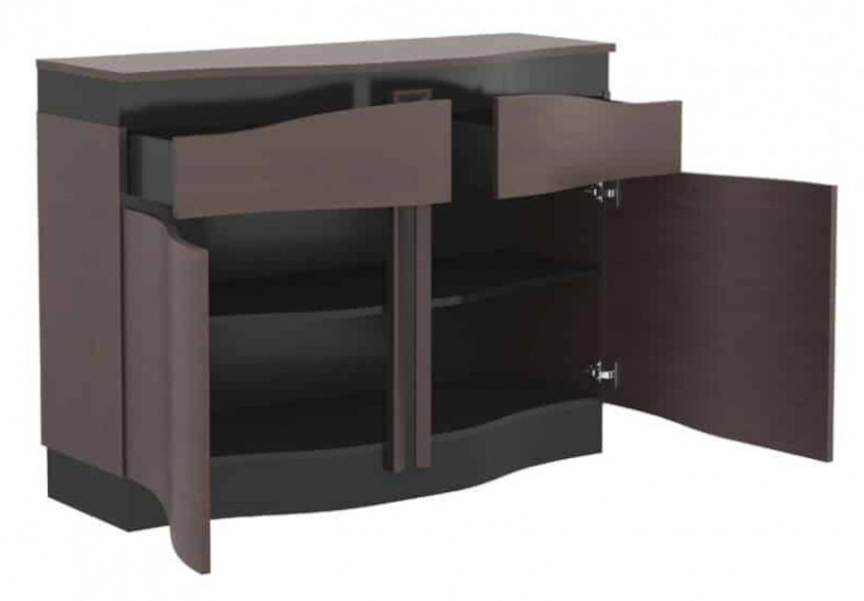 Komoda má 2 dvířka, za kterými jsou vloženy 2 lakované police a v horní části jsou 2 zásuvky na kovových pojezdech.