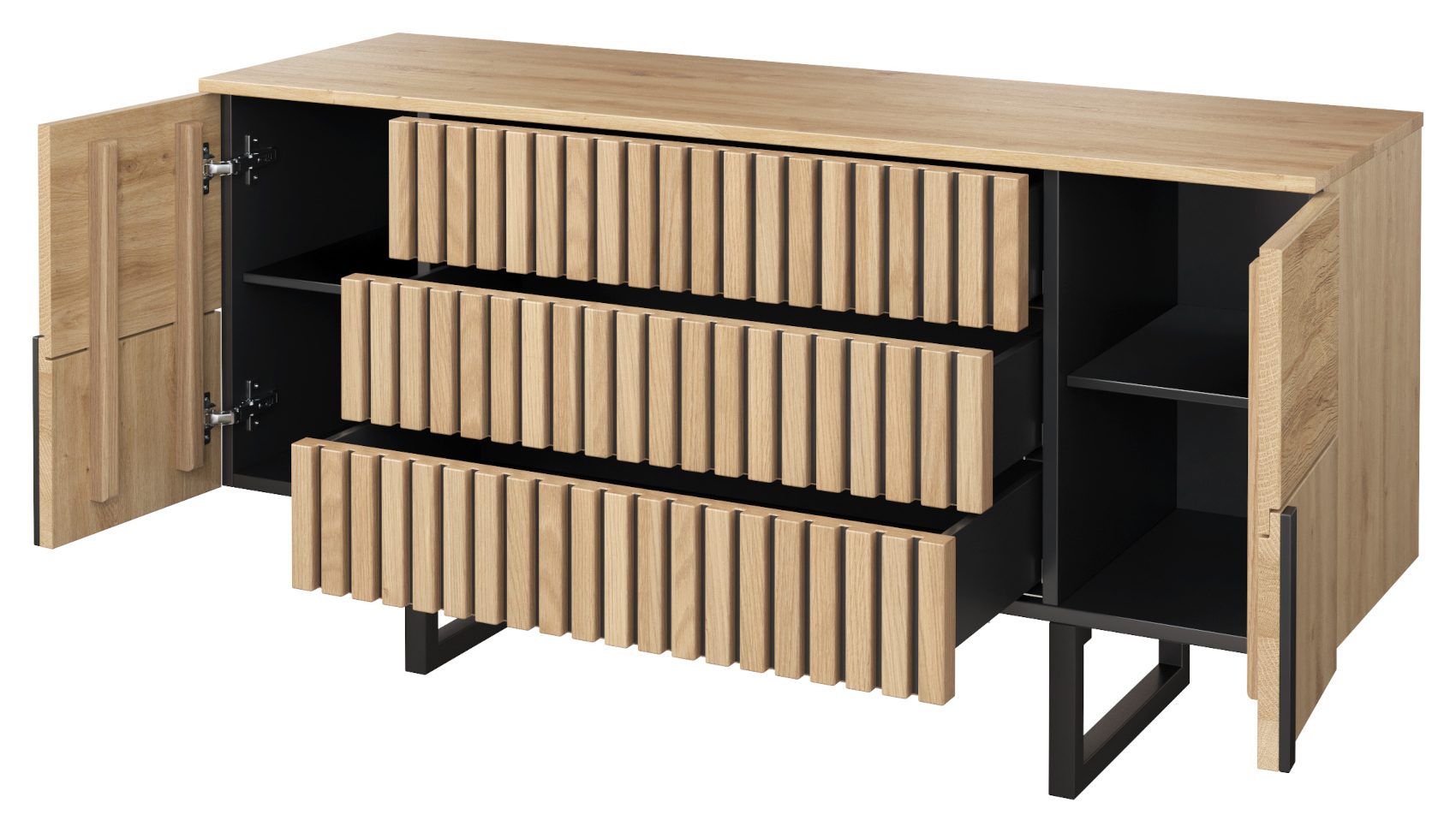 Moderní komoda Gintaro 2D3SZ vás zaujme svým jedinečným designem. Černé lamely na přední straně nábytku dodají nádech elegance a kovové a neobyčejně tvarované nohy provzdušní váš interiér. Komoda je vyrobena z masivního dubového dřeva a přírodní dubové dýhy. Kvalitní technologie lakování a moření navodí přírodní vzhled dřeva a zvýrazní tak jeho léta. Dvířka i zásuvky v celém systému mají tichý jednoduchý dotykový systém otevírání a zavírání - Push to open.