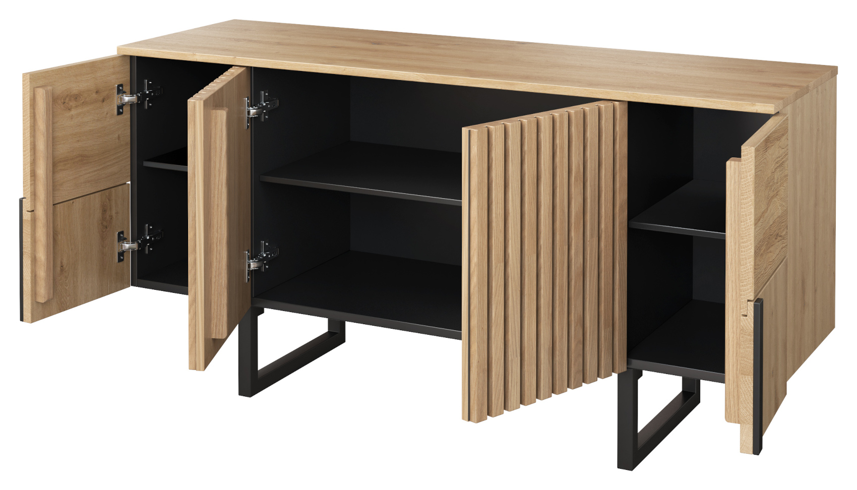 Moderní komoda Gintaro 4D vás zaujme svým jedinečným designem. Černé lamely na přední straně nábytku dodají nádech elegance a kovové a neobyčejně tvarované nohy provzdušní váš interiér. Komoda je vyrobena z masivního dubového dřeva a přírodní dubové dýhy. Kvalitní technologie lakování a moření navodí přírodní vzhled dřeva a zvýrazní tak jeho léta. Dvířka i zásuvky v celém systému mají tichý jednoduchý dotykový systém otevírání a zavírání - Push to open.