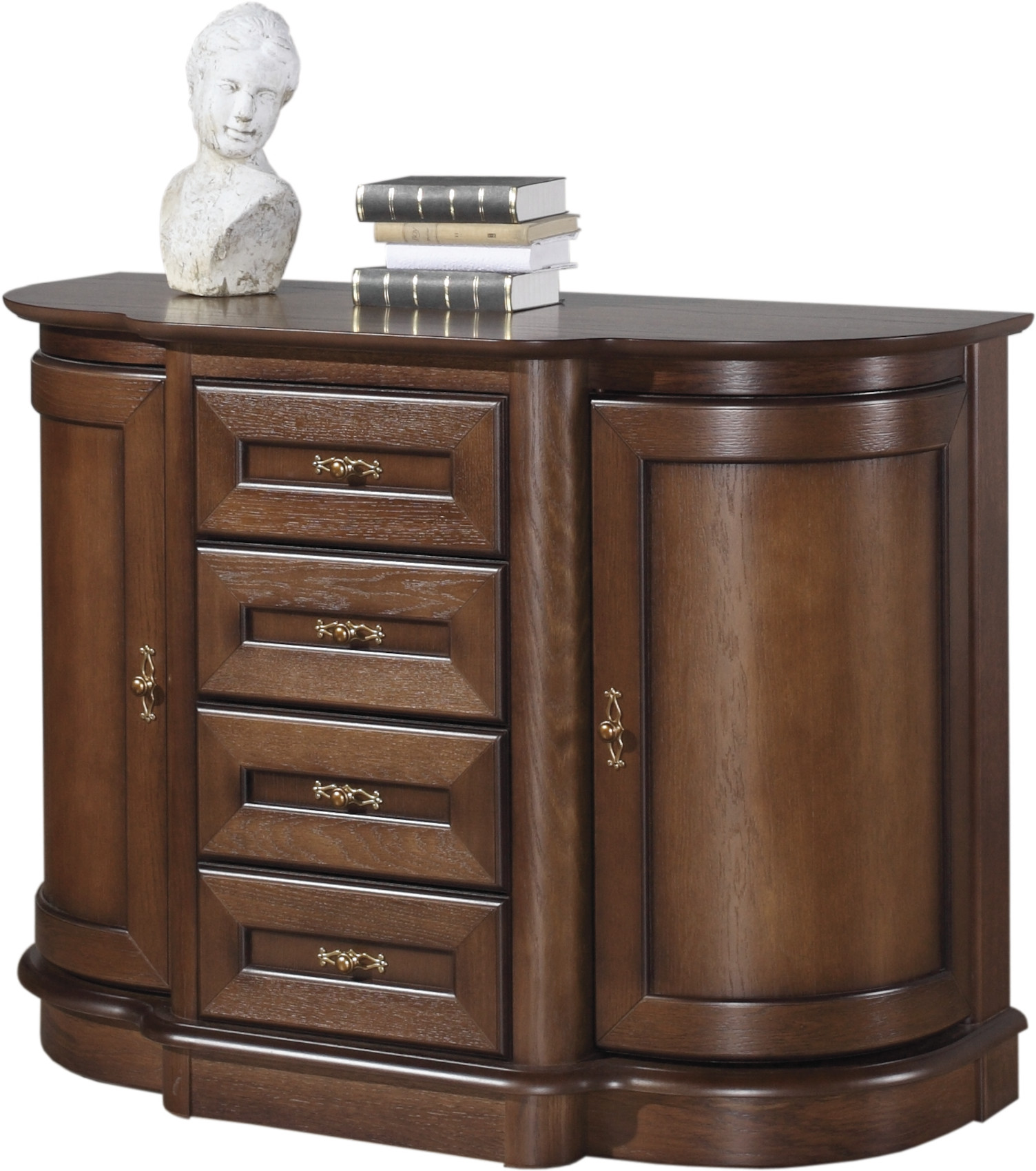 Komoda Afrodyta malá 2D4SZ vás zaujme svým luxusem a elegancí. Veškerý nábytek z tohoto systému je jedinečný svými zaoblenými bočními dvířky. Vitrína je vyrobena z přírodní dubové dýhy. Speciální lakování a moření dodává nábytku design přírodního dřeva a zvýrazňuje tak strukturu lét. Máte možnost si vybrat ze 2 barevných variant se zlatými úchyty.