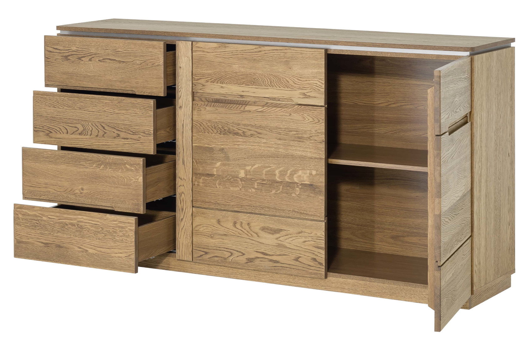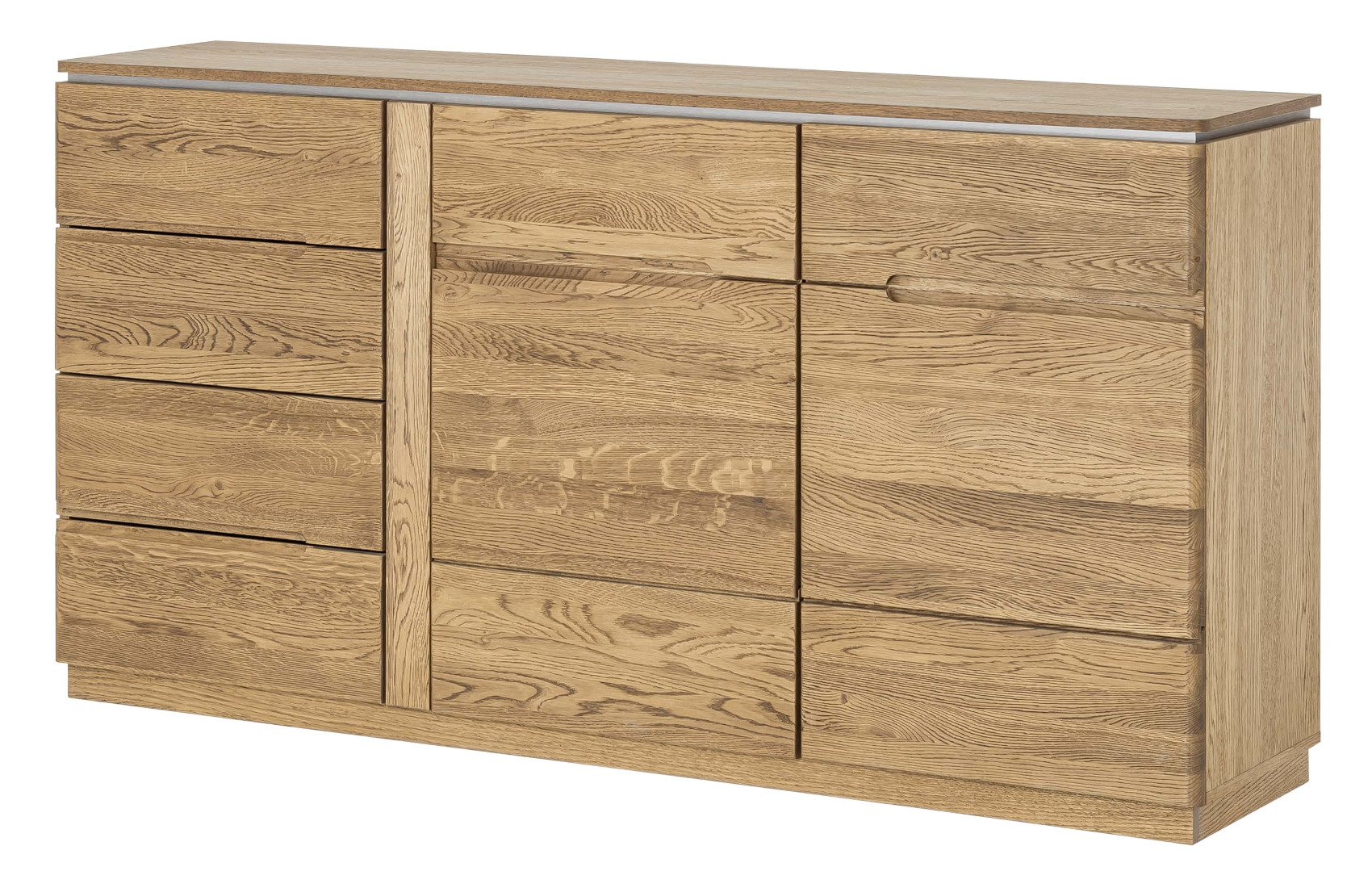 Moderní komoda Montenegro 45 vás zaujme svým elegantní designem. Přední část je vyrobena z masivního dubové dřeva a korpus z přírodní dubové dýhy. Jedinečným prvkem celého systému jsou kovové detaily pod horní deskou.