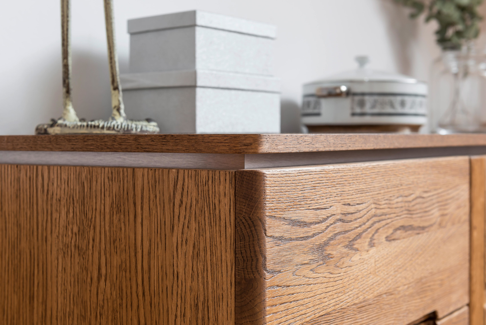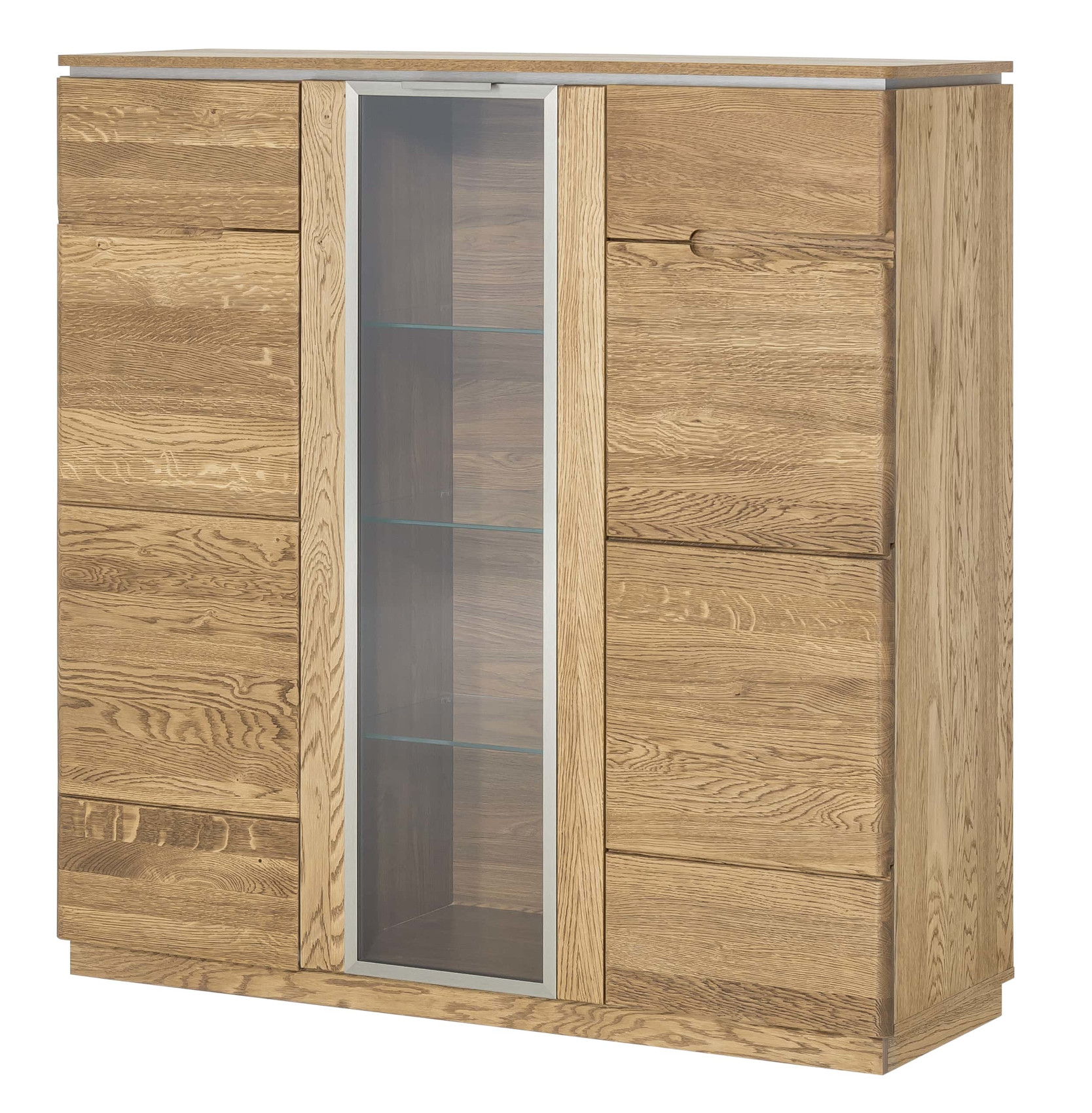 Moderní komoda Montenegro 48 vás zaujme svým elegantní designem. Přední část je vyrobena z masivního dubové dřeva a korpus z přírodní dubové dýhy. Jedinečným prvkem celého systému jsou kovové detaily pod horní deskou. Dvířka a zásuvky mají kovové úchytky.