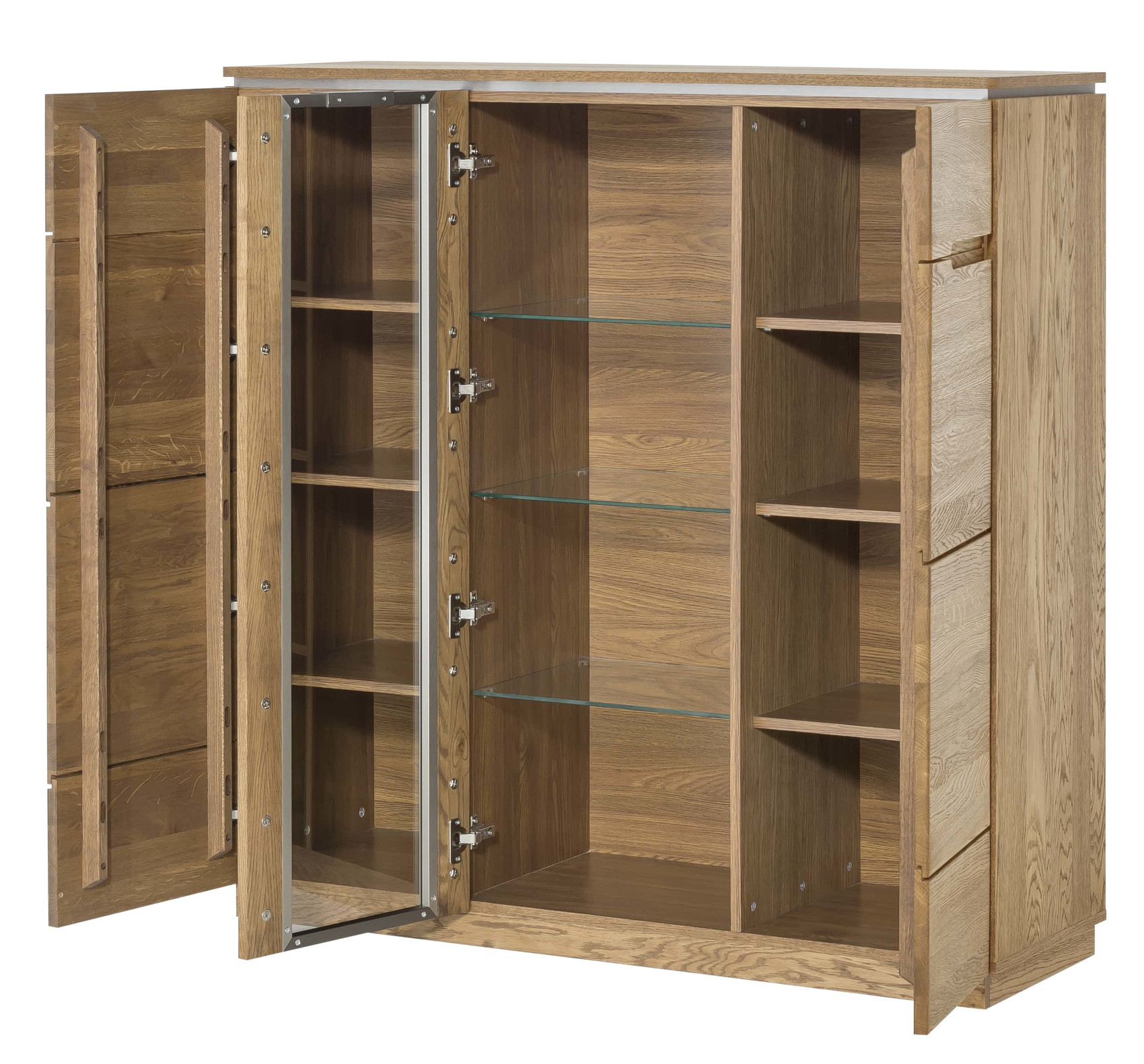 Komoda má 2 plná dvířka a mezi nimi 1 prosklená dvířka. Za plnými dvířky je vloženo 6 lakovaných polic a za prosklenými jsou 3 skleněné police.