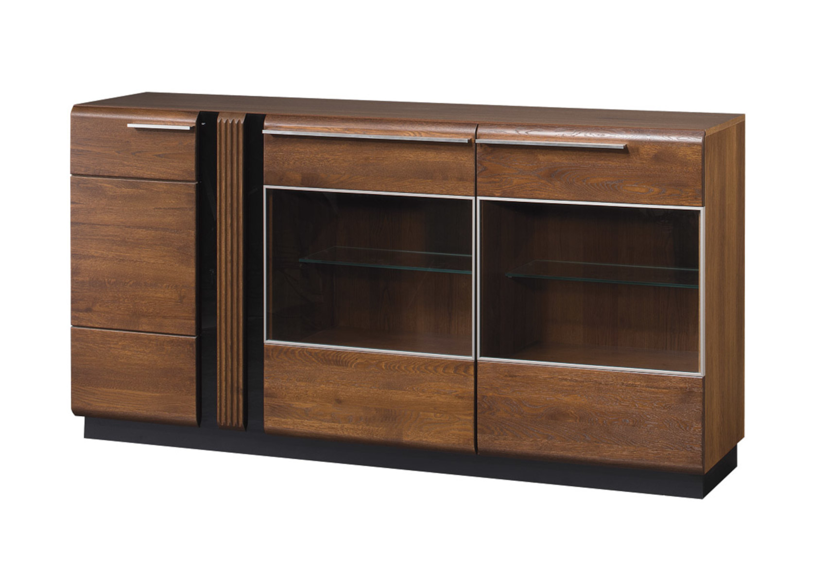 Moderní komoda Porti prosklená 48 vás zaujme svým luxusním designem. Přední část je vyrobena z masivního dubového dřeva s černými skleněnými detaily a korpus je z přírodní dubové dýhy. Celý systém Porti má kovové úchytky. Máte na výběr ze 2 barevných variant.