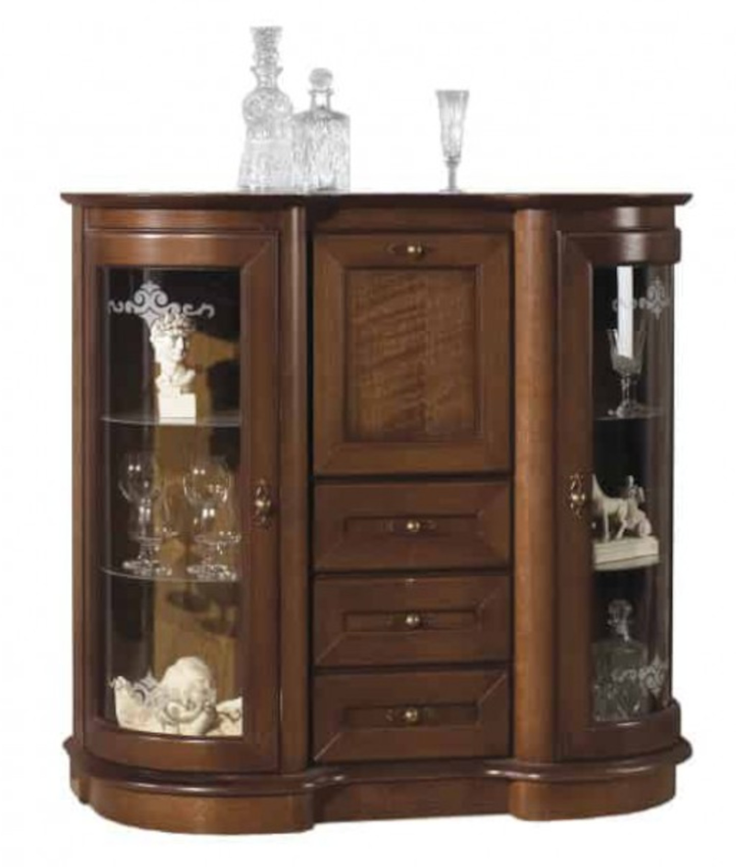 Komoda Afrodyta s barem 3D3SZ vás zaujme svým luxusem a elegancí. Veškerý nábytek z tohoto systému je jedinečný svými zaoblenými bočními dvířky. Vitrína je vyrobena z přírodní dubové dýhy. Speciální lakování a moření dodává nábytku design přírodního dřeva a zvýrazňuje tak strukturu lét. Máte možnost si vybrat ze 2 barevných variant se zlatými úchyty.