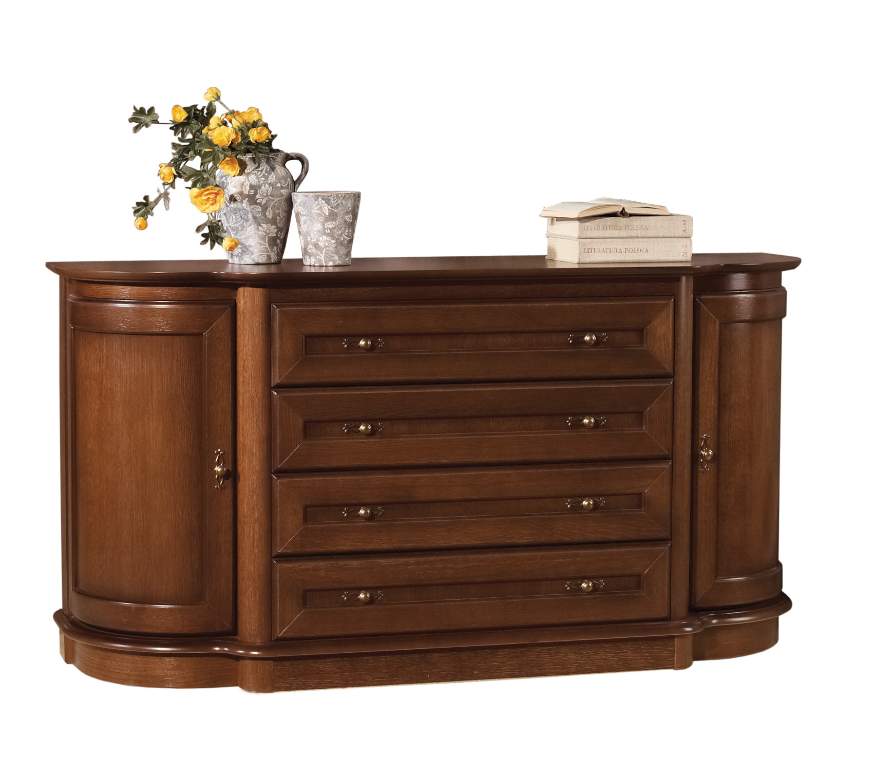 Komoda má 2 boční plná dvířka a v přední části 4 zásuvky na kovových pojezdech.