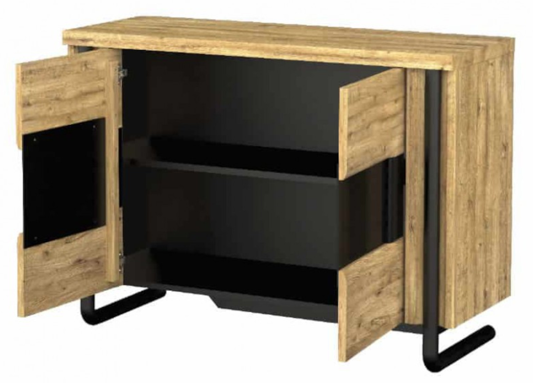 Komoda Omega 2D vás zaujme svým luxusním designem. Přední část je vyrobena z masivního dubového dřeva a korpus z přírodní dubové dýhy. Jedinečnými prvky jsou černé kožené detaily na dvířkách a ohnuté ocelové tyče, které jsou díky práškovému lakování odolné vůči poškození. Kvalitní lakování a moření dodává nábytku přirozený vzhled dřeva a zdůrazňuje strukturu lét. Dvířka mají jednoduchý dotykový systém otevírání - Push to open.
