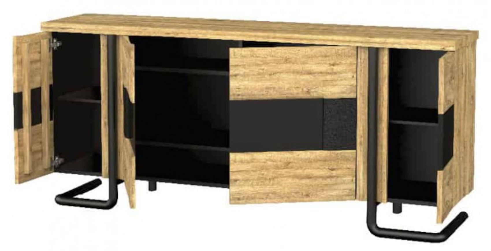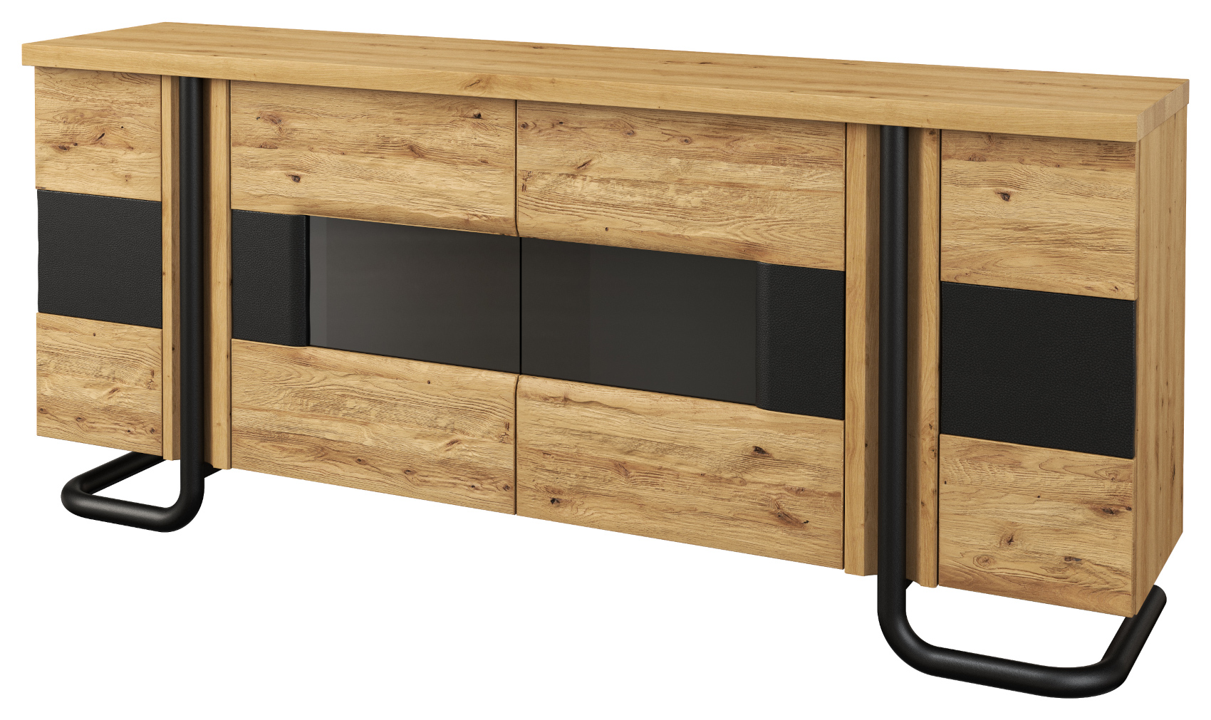 Komoda Omega 4D vás zaujme svým luxusním designem. Přední část je vyrobena z masivního dubového dřeva a korpus z přírodní dubové dýhy. Jedinečnými prvky jsou černé kožené detaily na dvířkách a ohnuté ocelové tyče, které jsou díky práškovému lakování odolné vůči poškození. Kvalitní lakování a moření dodává nábytku přirozený vzhled dřeva a zdůrazňuje strukturu lét. Dvířka mají jednoduchý dotykový systém otevírání - Push to open.