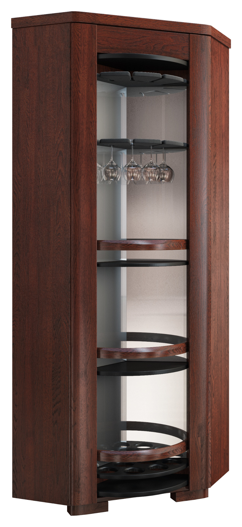 Díky rotačnímu kloubu, můžete změnit vnitřní uspořádání barové skříňky pouhým otočením. Z jedné strany je lakovaný policový systém a na druhé straně je vinný bar. Součástí baru jsou také závěsy na sklenice a držáky na uložení vína. Za příplatek si můžete zvolit variantu s LED podsvícením, které vám zpříjemní atmosféru ve večerních hodinách.