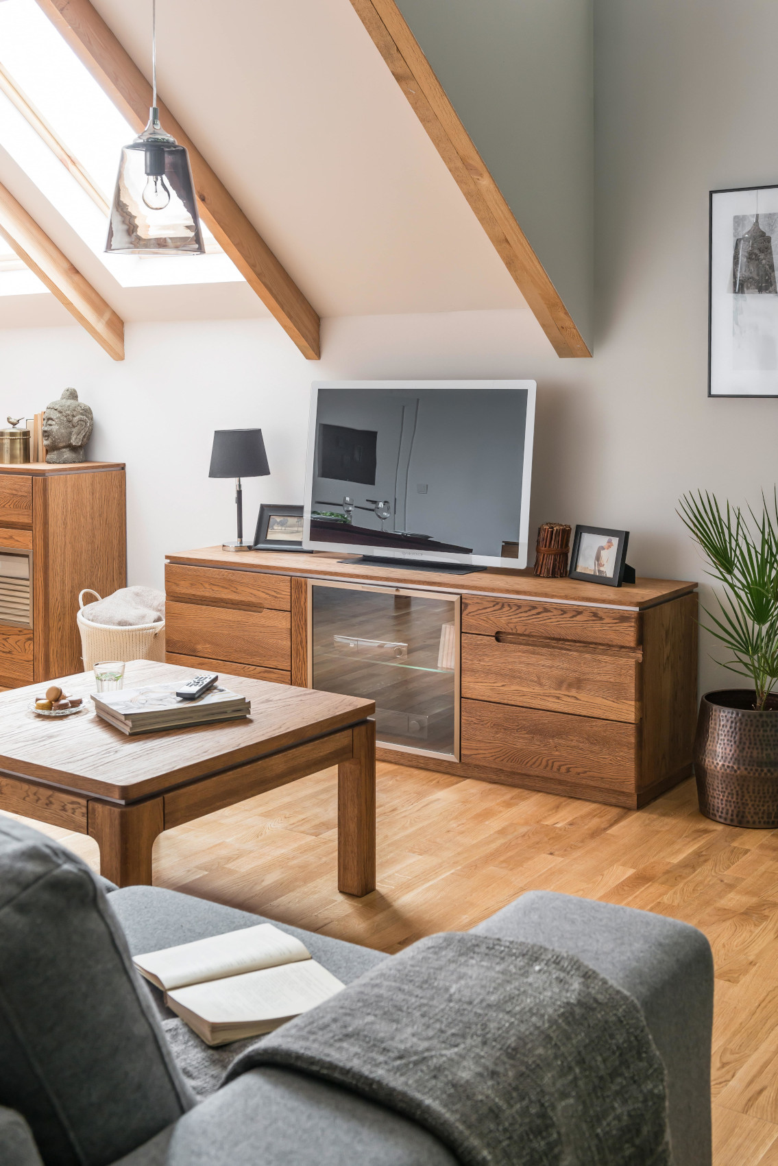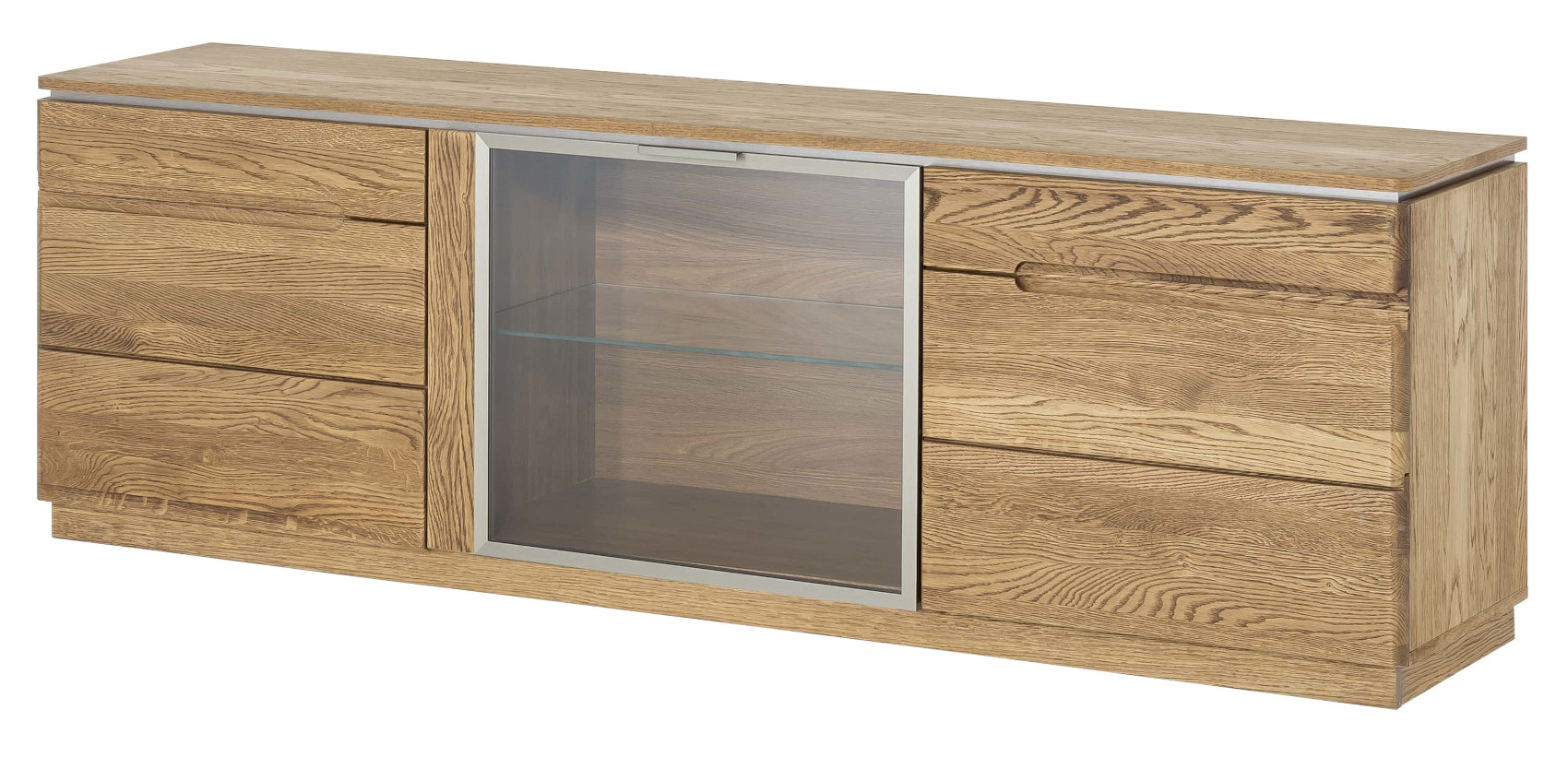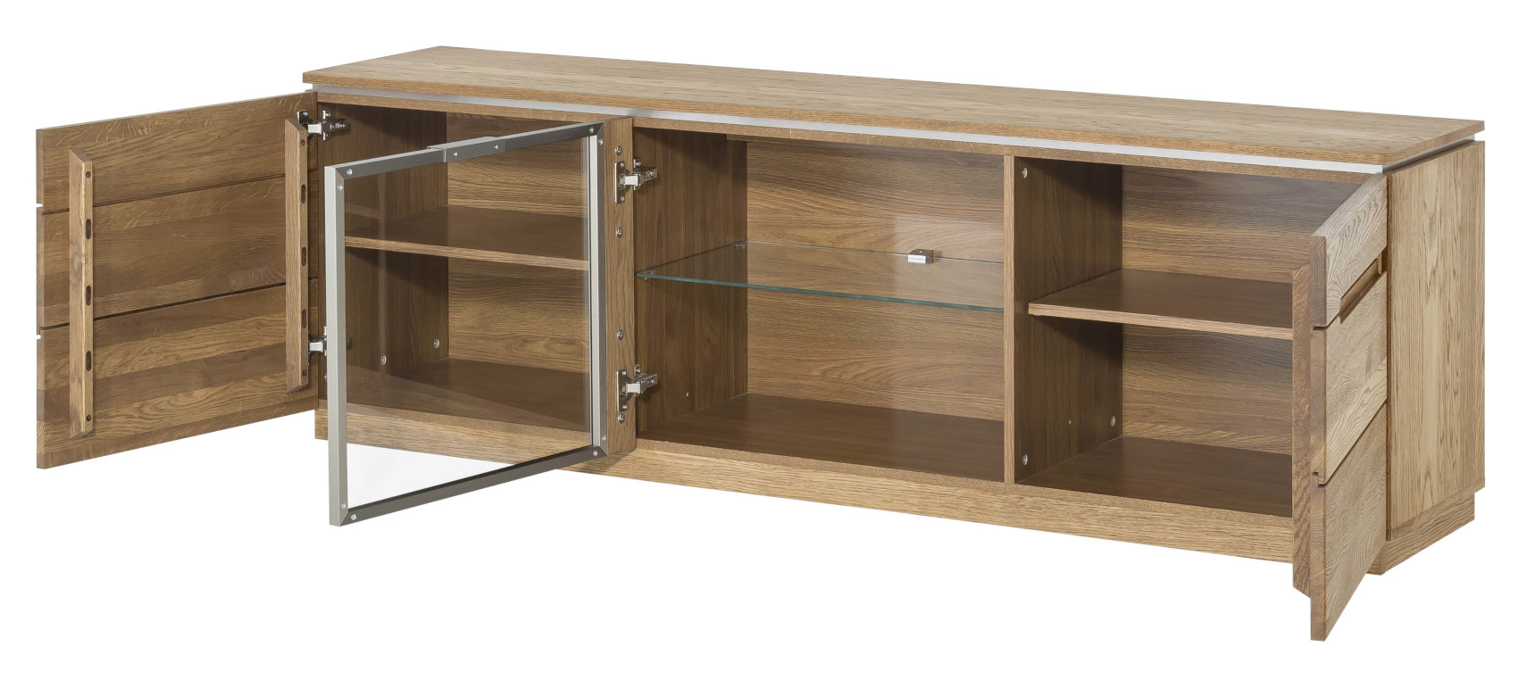 Moderní RTV komoda Montenegro 26 vás zaujme svým elegantní designem. Přední část je vyrobena z masivního dubové dřeva a korpus z přírodní dubové dýhy. Jedinečným prvkem celého systému jsou kovové detaily pod horní deskou. Dvířka mají kovové úchytky.