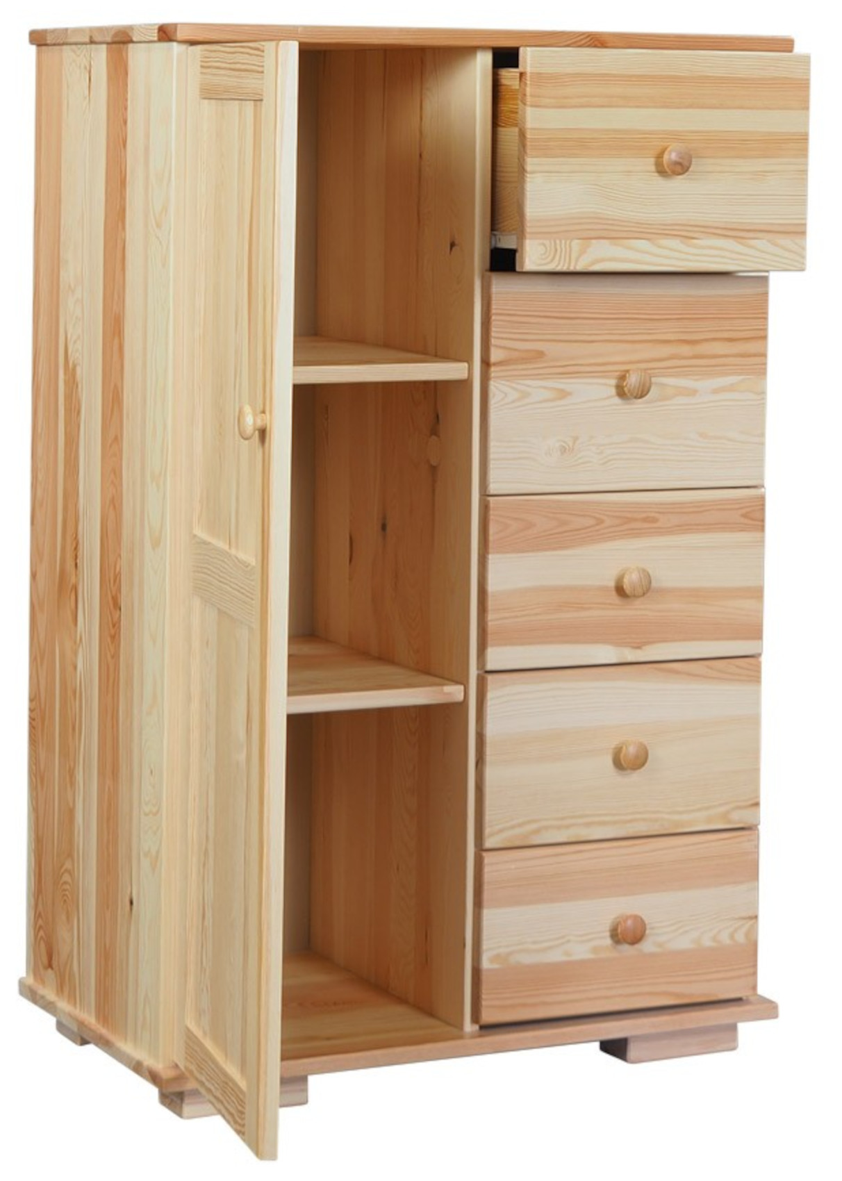 Skříňka má 5 malých, ale prostorných zásuvek na kovových pojezdech a 1 dvířka, za kterými jsou vloženy 2 police.