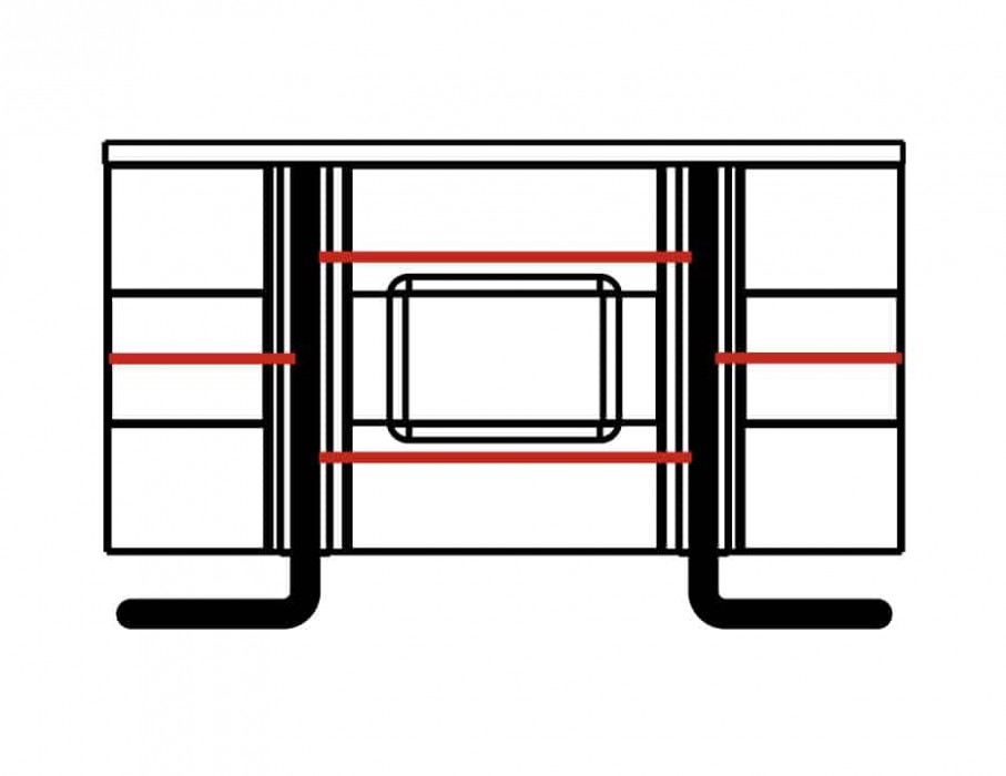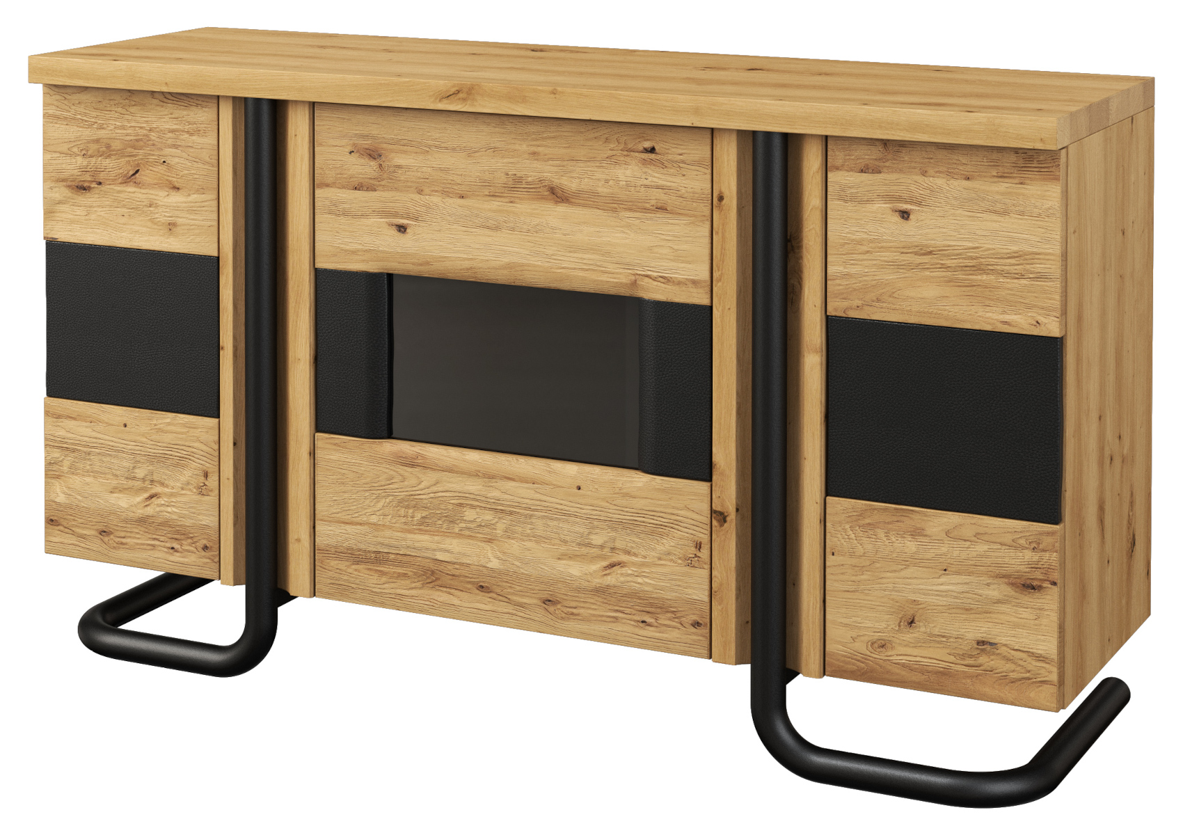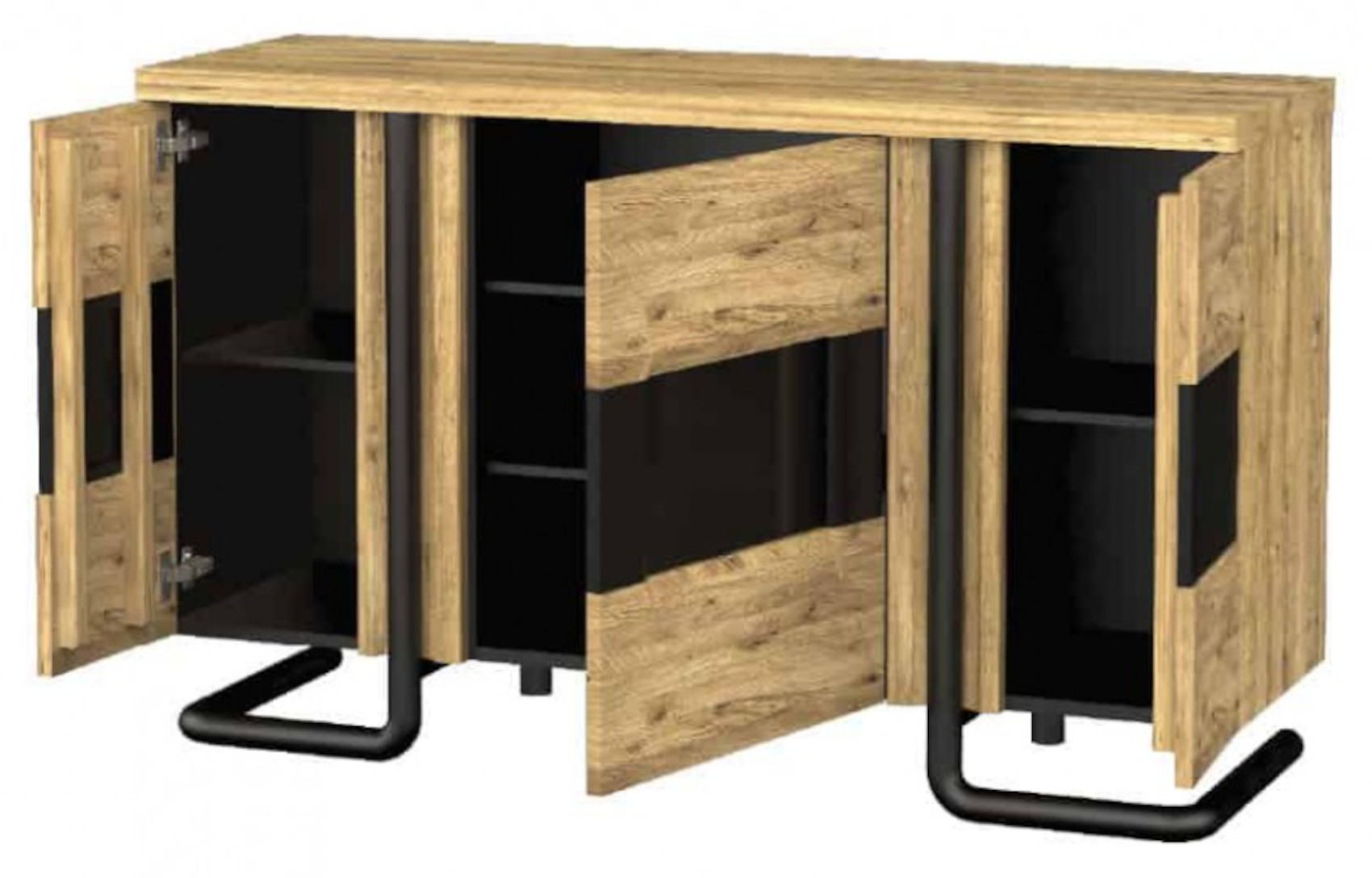 Komoda Omega 3D vás zaujme svým luxusním designem. Přední část je vyrobena z masivního dubového dřeva a korpus z přírodní dubové dýhy. Jedinečnými prvky jsou černé kožené detaily na dvířkách a ohnuté ocelové tyče, které jsou díky práškovému lakování odolné vůči poškození. Kvalitní lakování a moření dodává nábytku přirozený vzhled dřeva a zdůrazňuje strukturu lét. Dvířka mají jednoduchý dotykový systém otevírání - Push to open.