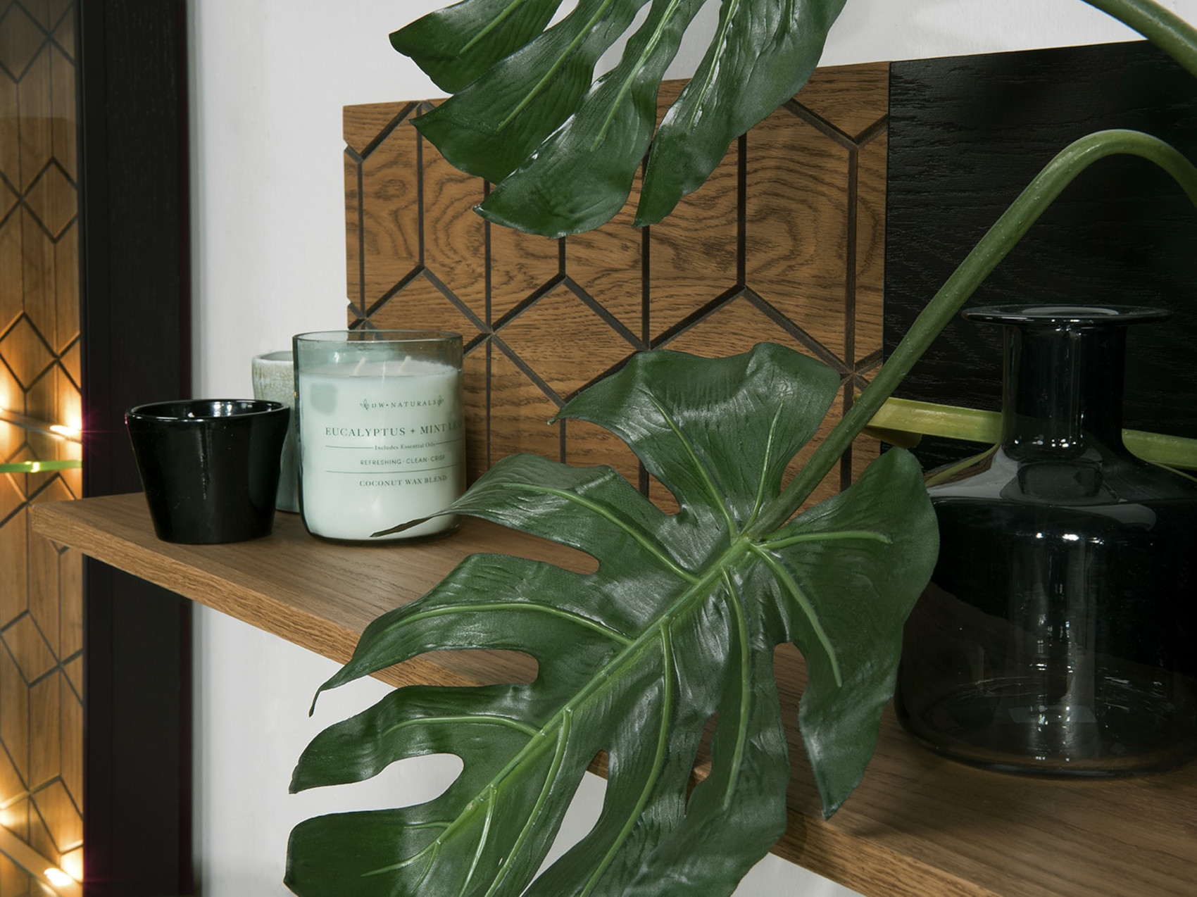 Moderní police Mosaic 35 dlouhá vás zaujme svým luxusním designem se strukturou přírodního dřeva. Je vyrobena z masivního dubového dřeva a přírodní dubové dýhy. Jedinečnými prvky jsou černé matné lakované detaily.