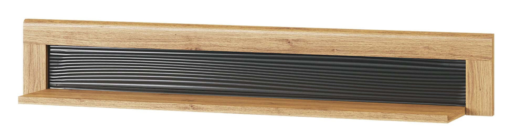 Moderní police Kama 35 dlouhá vás zaujme svým prostým designem s viditelnou strukturou dřevěných lét. Je vyrobena z lamina potaženého fólií, která navodí dojem přírodního dřeva. Jedinečným prvkem jsou matně černé lakované detaily.