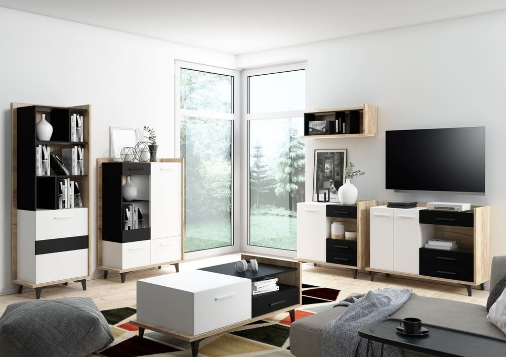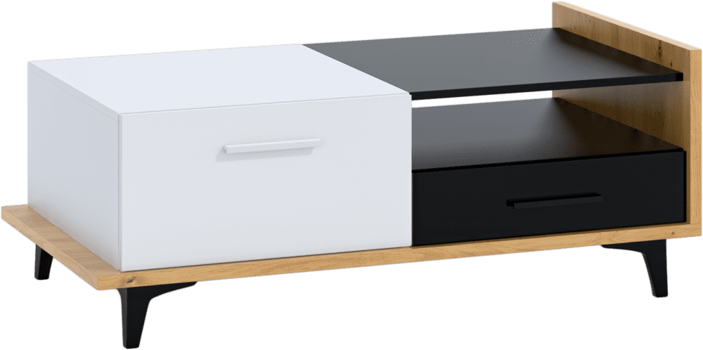 Součástí konferenční stolku jsou 2 plná dvířka (z každé strany 1 skříňka). V pravé části se nachází 2 zásuvky na kovových pojezdech a 1 otevřená nika k uložení vašich nezbytností.