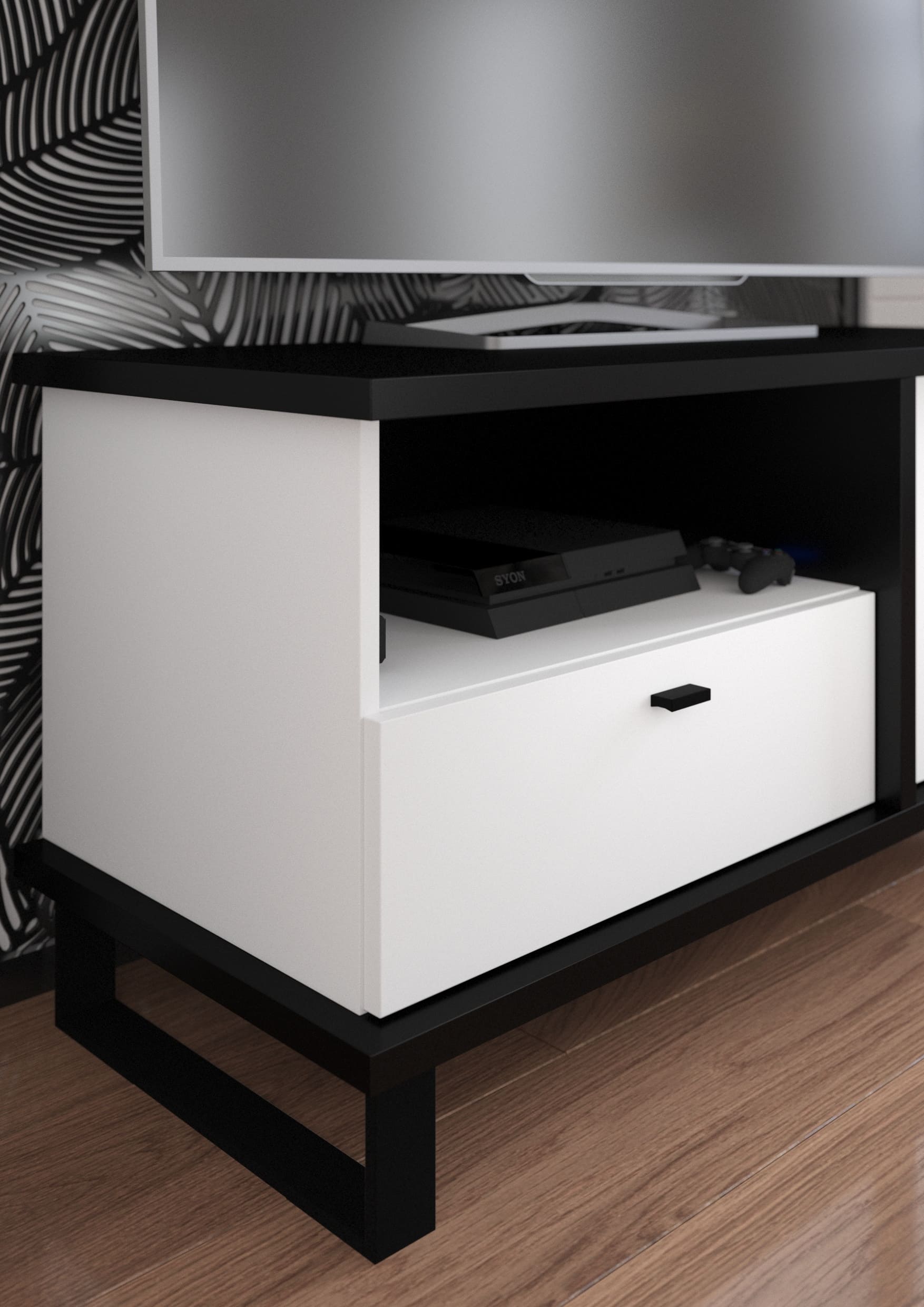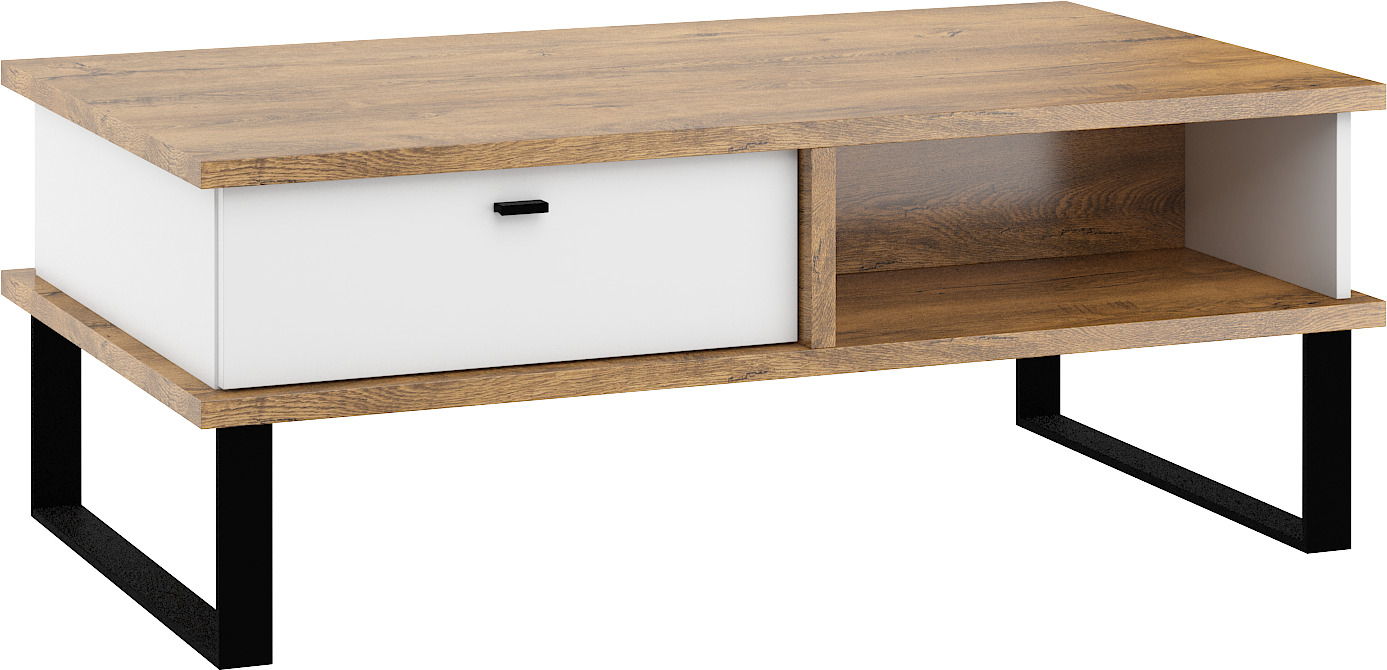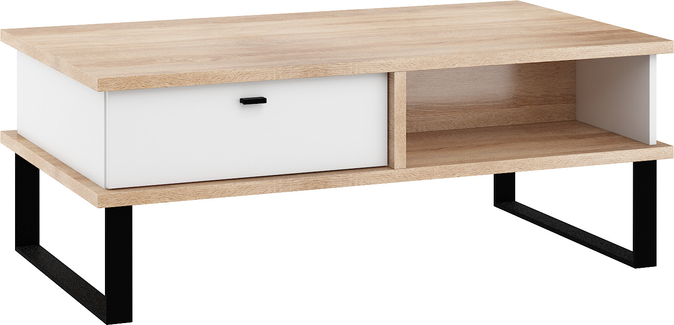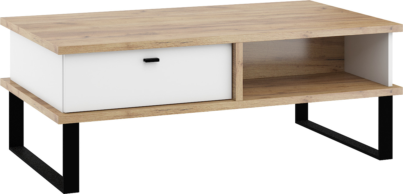 Konferenční stolek Cross 13 má 2 zásuvky a odkládací otevřené prostory. Stojí na kovových nožkách vysokých 22 cm.