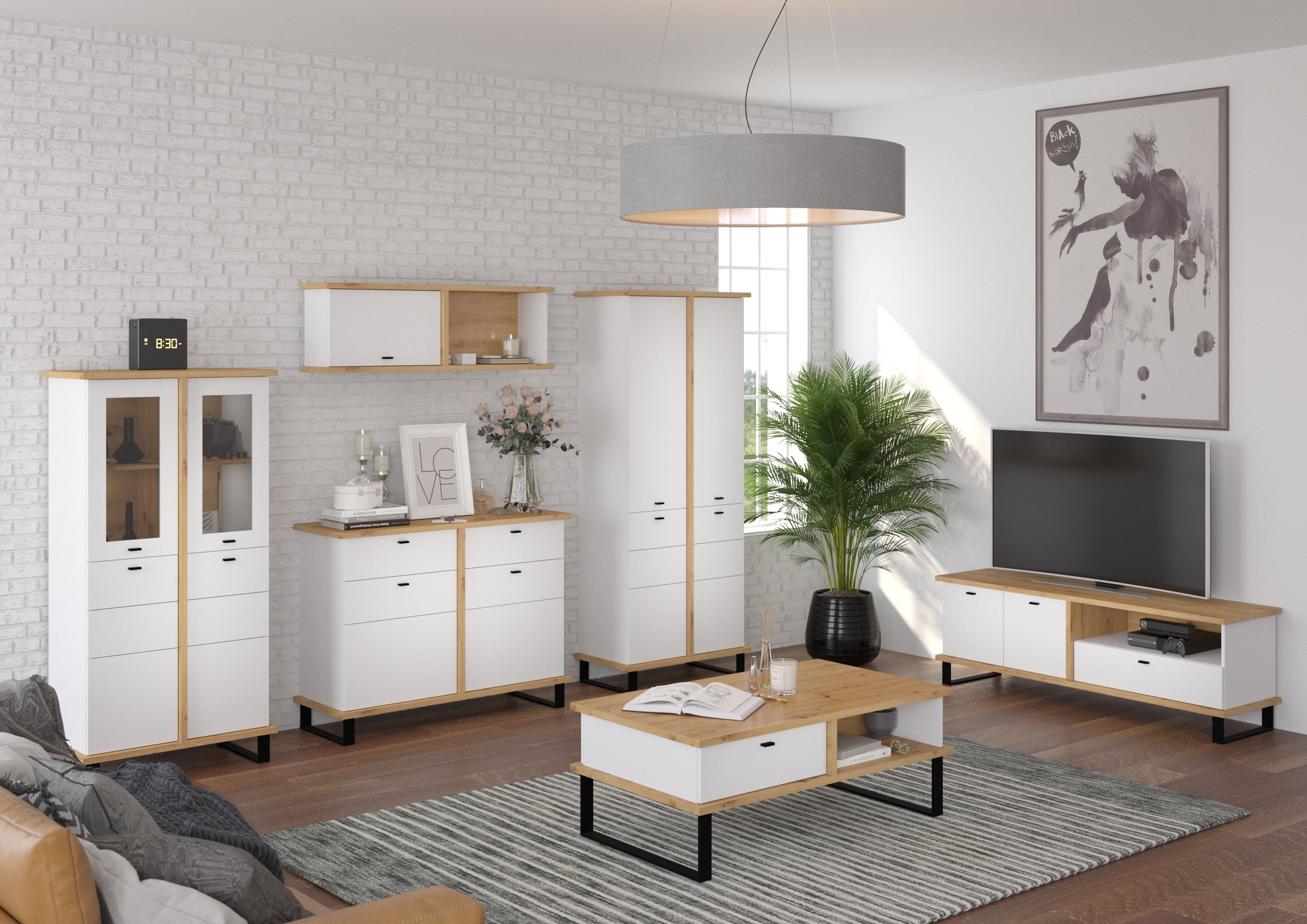 Vitríny mají kouřová skla, která ještě více zdůrazní originální vzhled systému. Černou barvou vynikají i úchyty, jež doplňují barevné kombinace reflektující moderní trendy v bydlení. S kolekcí Cross nemůžete šlápnout vedle!