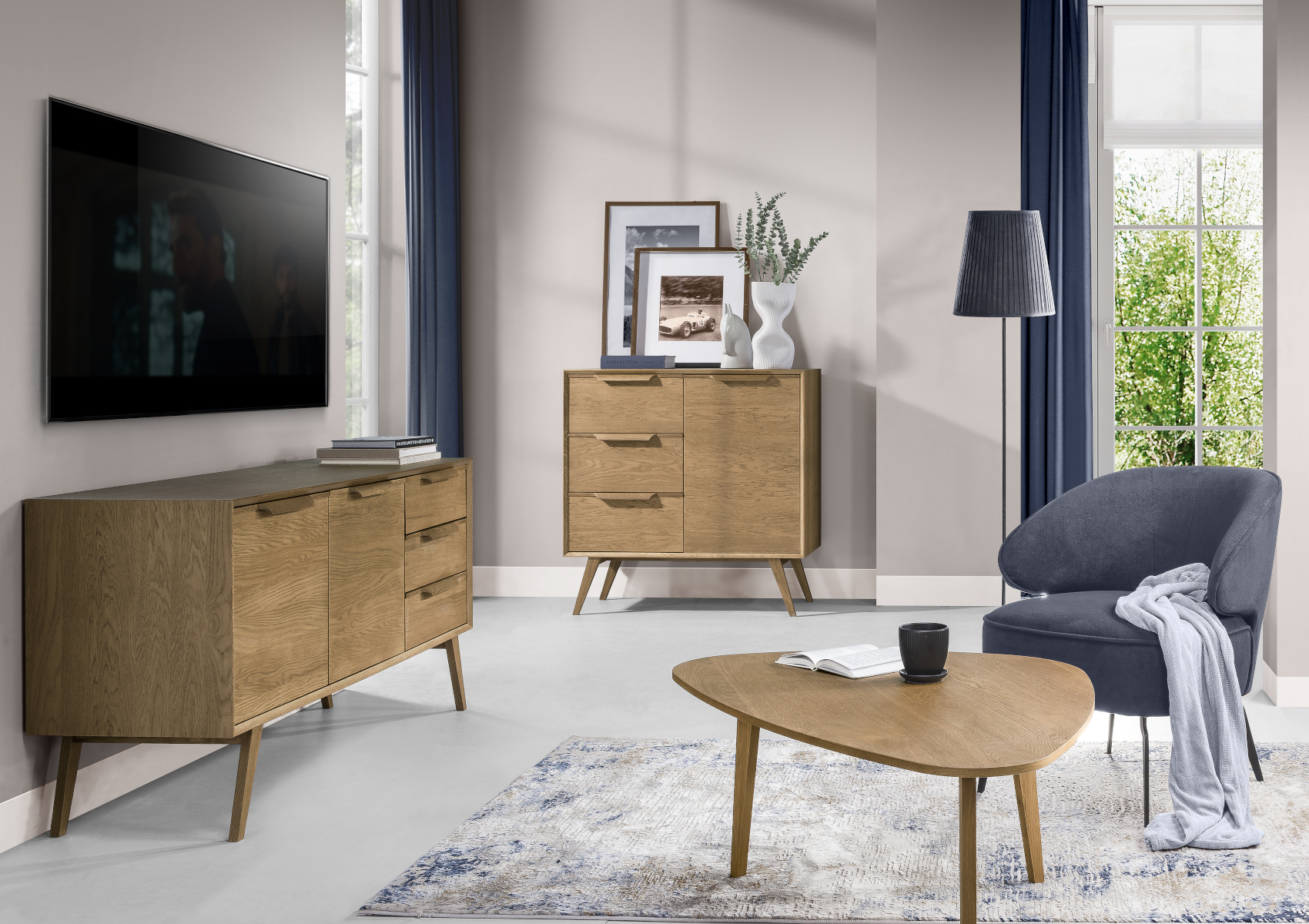 Konferenční stolek Leo 41 vás zaujme svým jednoduchým přírodním designem se strukturou dřevěných lét. Konstrukce nábytku je vyrobena z masivního dubu. Přední dvířka a korpus jsou vyrobeny z přírodní dubové dýhy v kombinaci s přírodním dubem. Nábytek stojí na vysokých nožkách, které provzdušní celý váš interiér. Ty jsou stejně jako úchyty vyrobeny z přírodního masivního dřeva.