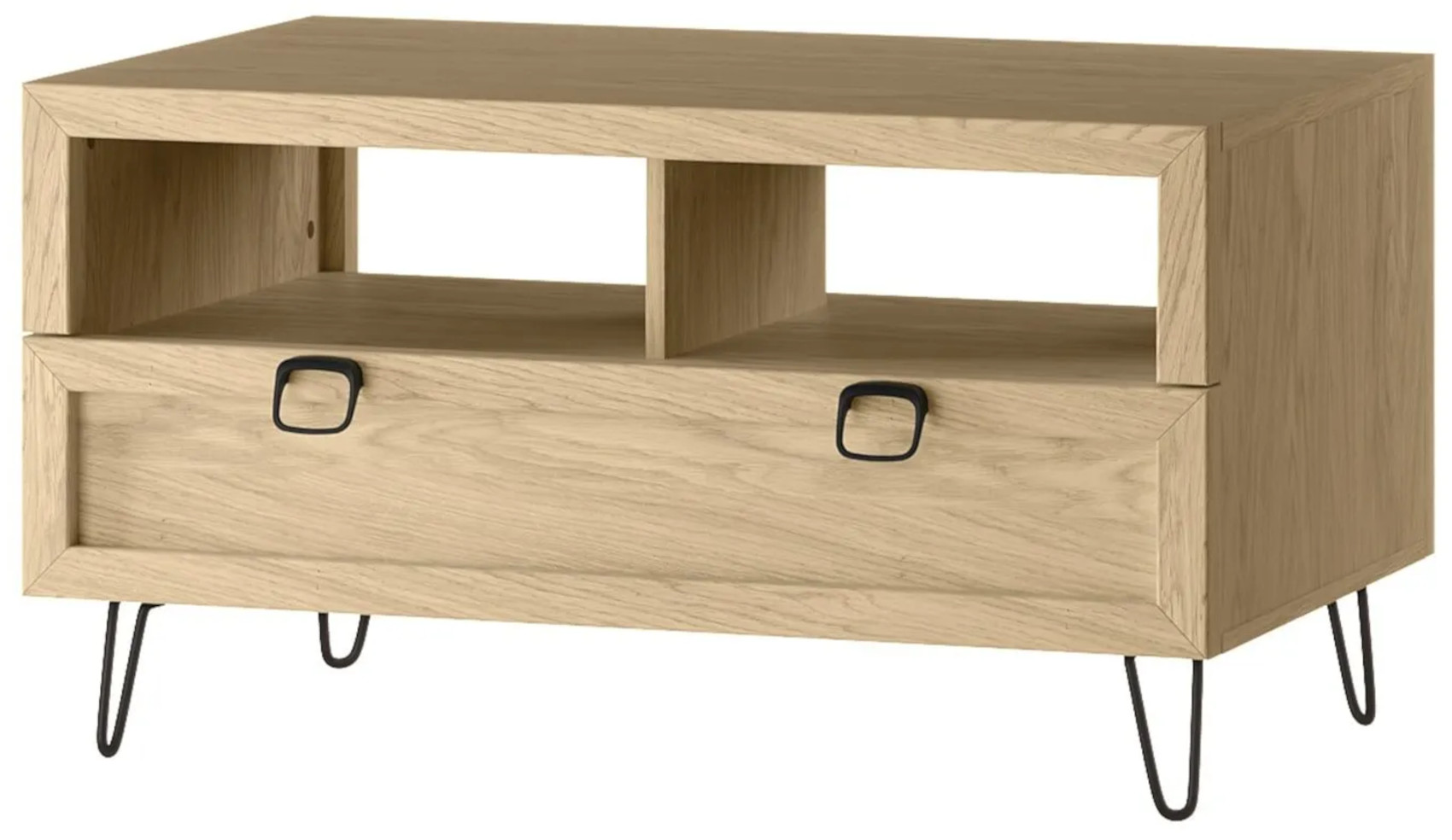 Pod horní deskou jsou 2 otevřené niky k uložení dálkového ovládání, knih nebo časopisů. Pod nimi je dlouhá zásuvka na kovových pojezdech.