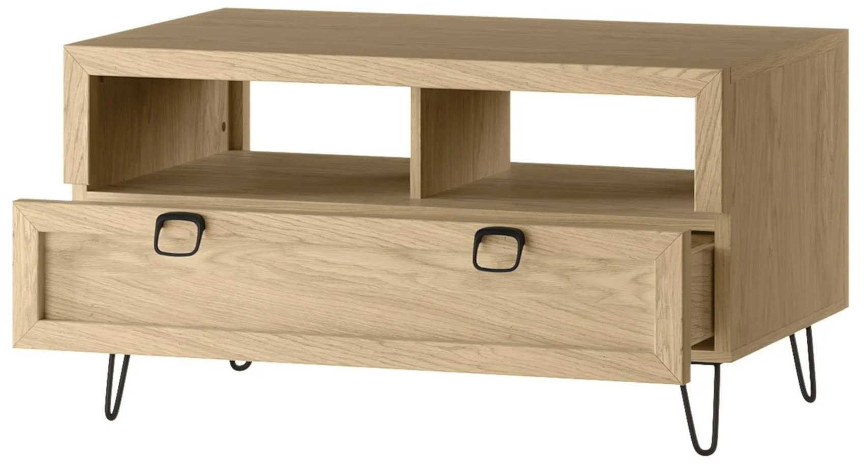 Konferenční stolek Limbo 41 vás zaujme svým přírodním designem s viditelnou strukturou dřevěných lét. Přední zásuvka, se systémem tichého dovírání, je vyrobena z masivního dubového dřeva a korpus z přírodní dubové dýhy, která je potažena fólií. Součástí stolku jsou kovové úchyty a nožky v odstínu černý mat, které dodají nábytku nádech elegance a provzdušní váš celkový prostor.