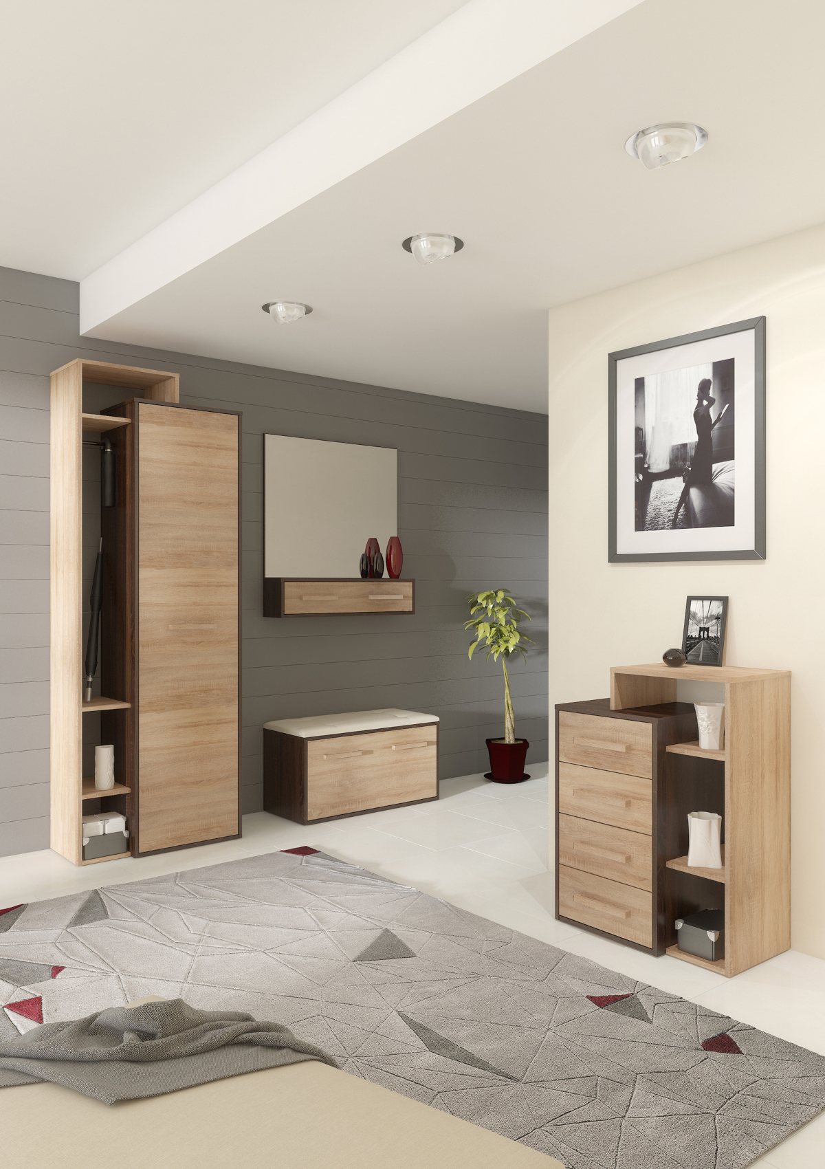 Součástí je několik otevřených nik k uložení vašich nezbytností.