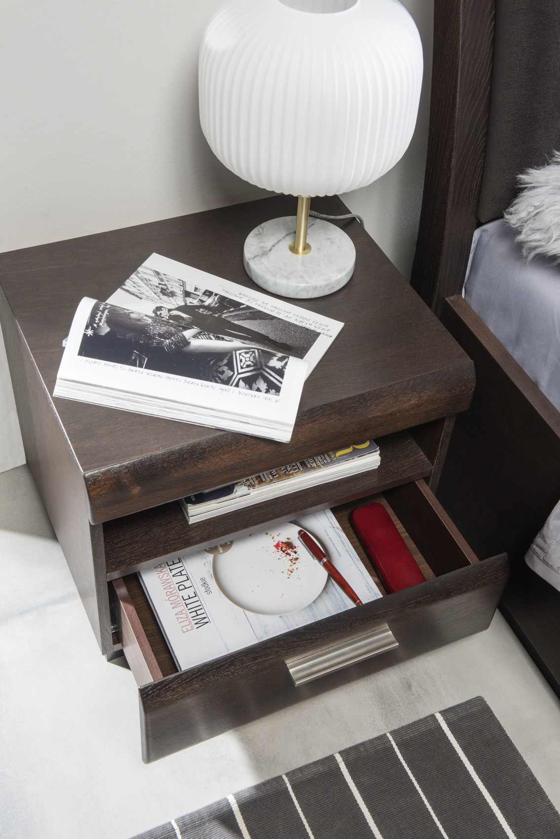Konferenční stolek má 1 zásuvku na kovových pojezdech. Pod horní deskou je otevřená nika k uložení knih nebo časopisů.