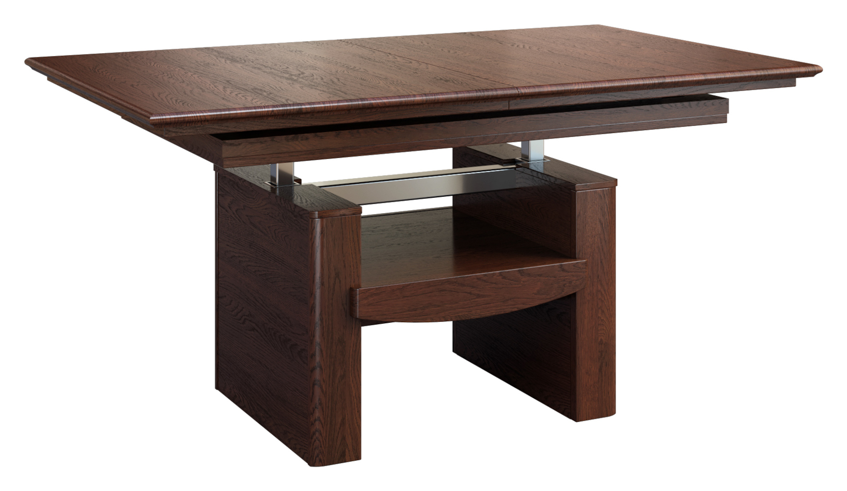 Pomocí kovového kolejnicového systému můžete stolek rozložit do šířky od 130 cm do 218 cm. Pod horní deskou jsou vloženy 2 dřevěné vklady. Díky pneumatickým pístům s fixací zvednete stůl do výšky od 61 cm do 79 cm. Stolek tak získává charakter jídelního stolu.