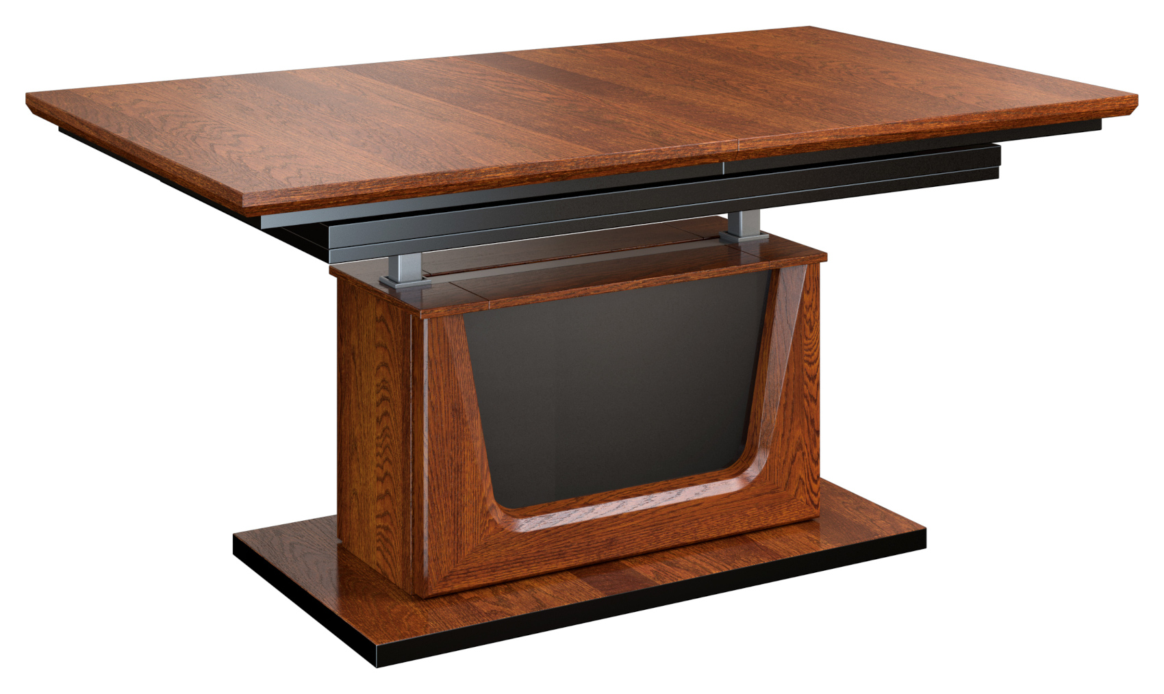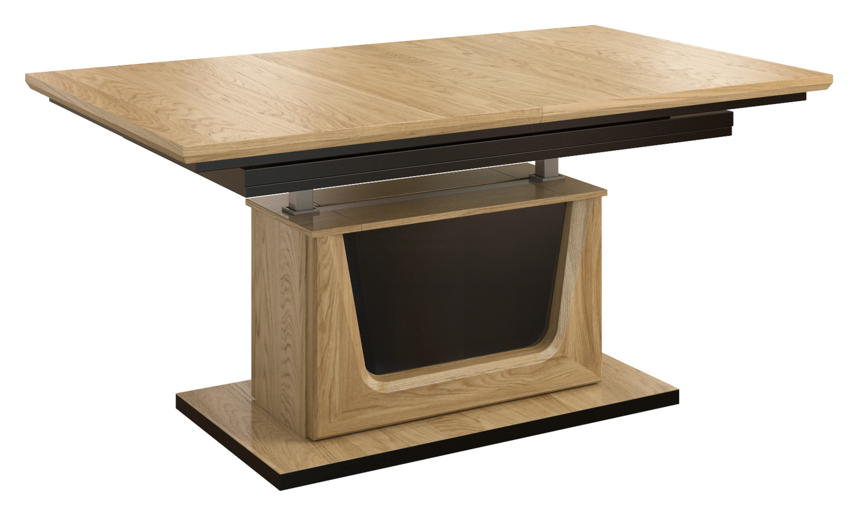 Pneumatický konferenční stolek Maganda III M vás zaujme svým moderním a luxusním designem. Je vyroben z přírodní dubové dýhy s detaily z masivního dubového dřeva a černými lakovanými prvky. Vzhledem k použitému materiálu se jedná o stabilní nábytek. Kvalitní technologie lakování a moření dodává nábytku přírodní vzhled a zvýrazňuje jeho léta. Máte možnost si vybrat ze 2 barevných variací moření dřeva.