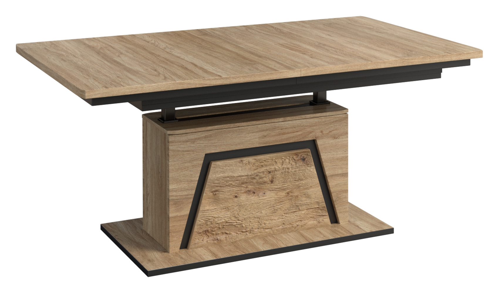 Pomocí kovového kolejnicového systému můžete stůl rozložit do šířky od 130 cm do 218 cm. Pod horní deskou jsou vloženy dřevěné vklady. Díky pneumatickým pístům s fixací zvednete stůl do výšky od 59 cm do 77 cm. Stůl tak získává charakter jídelního stolu.