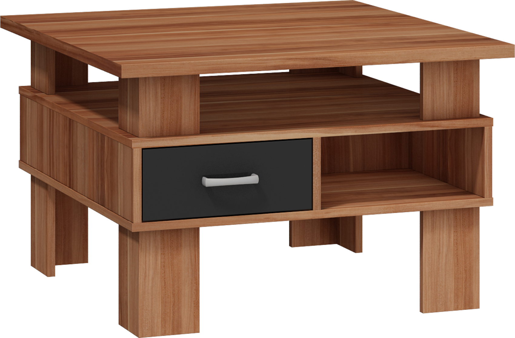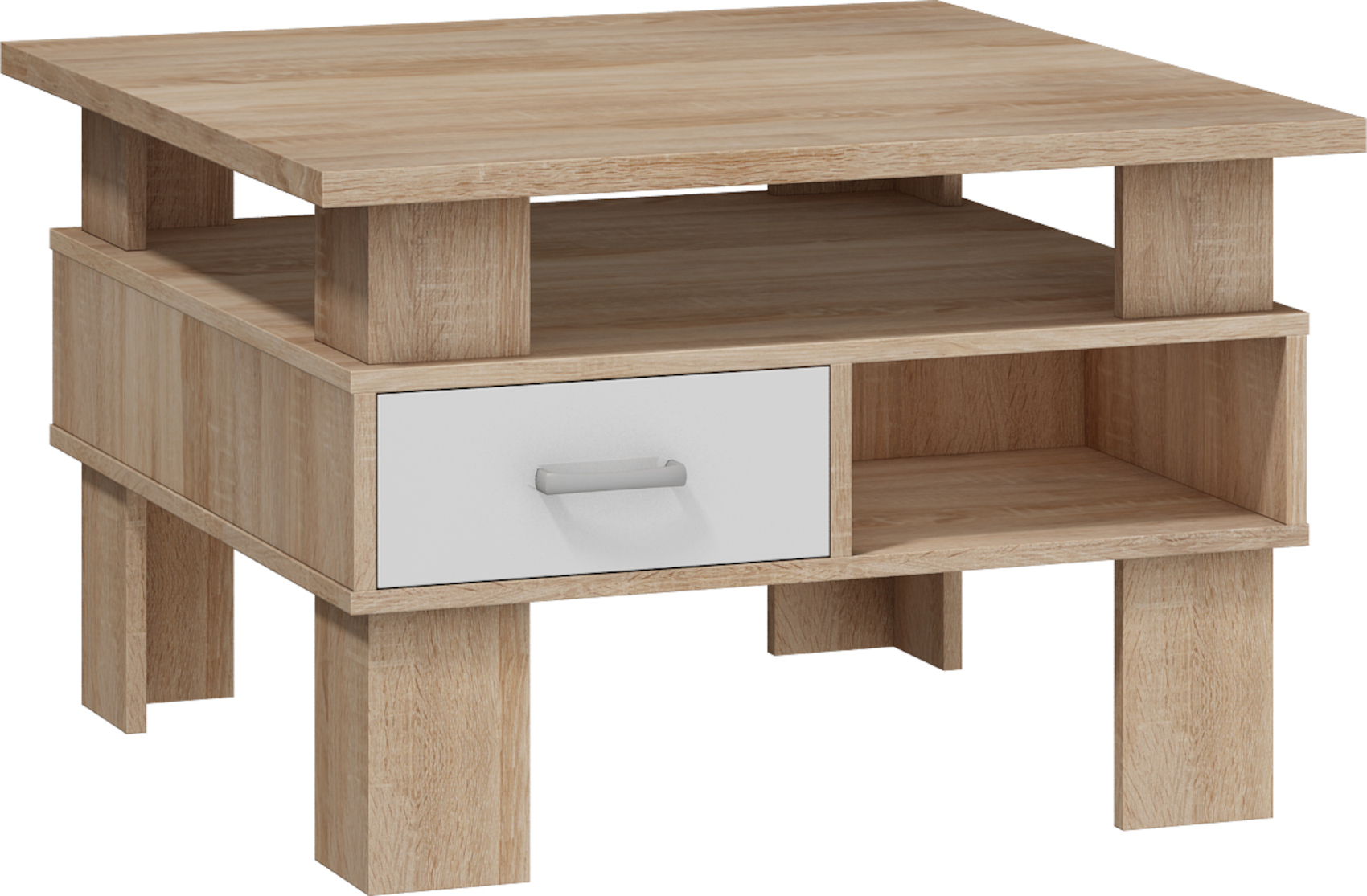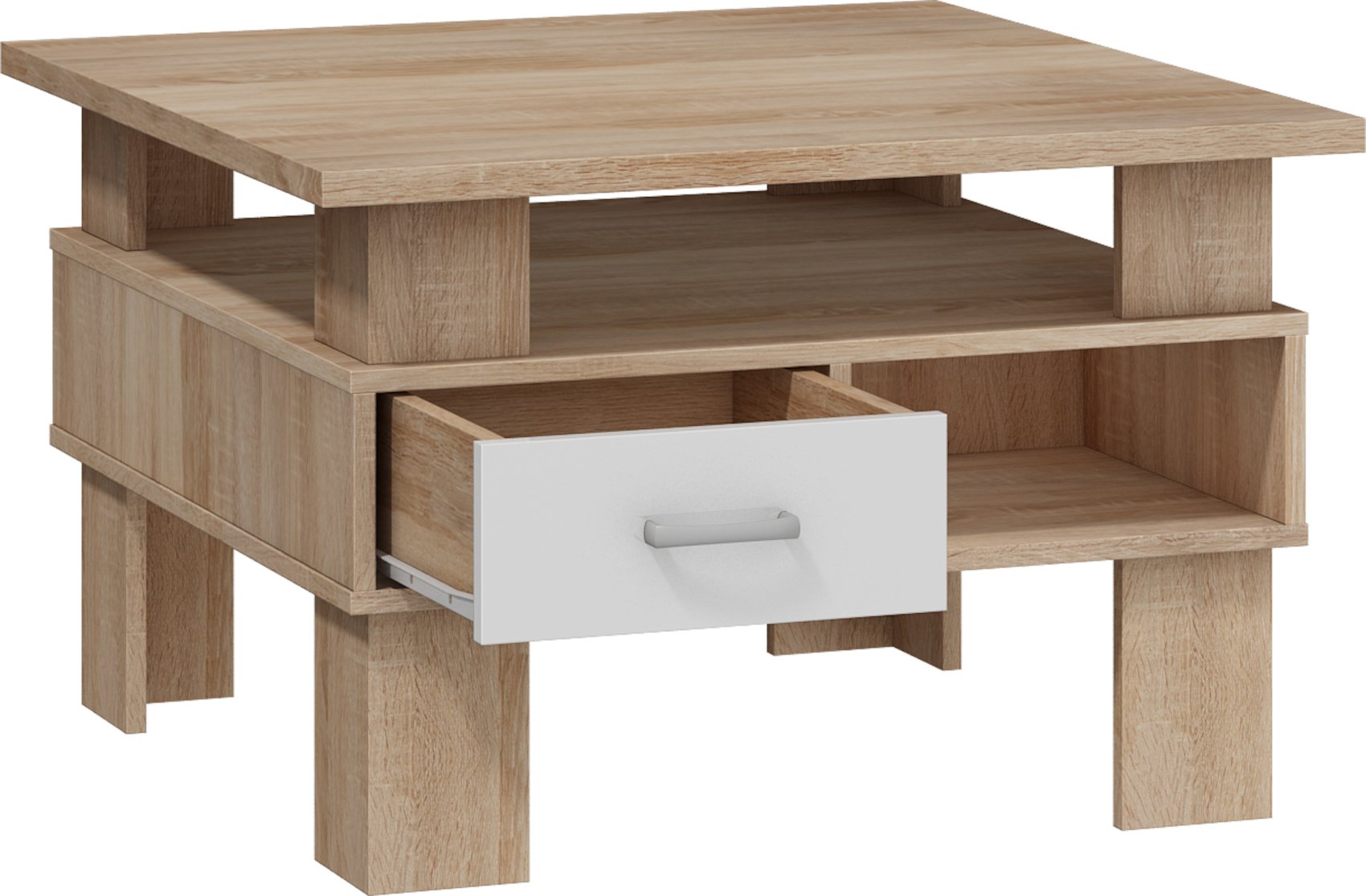 Konferenční stolek Gamma. Stolek má prostornou polici a dvě praktické zásuvky. Je vhodný především do interiérů, kde je kladen důraz na moderní a stylové bydlení. Horní deska je z 25 mm silného lamina, zbytek korpusu z 16 mm lamina. ABS hrany mají sílu 0,6 mm.