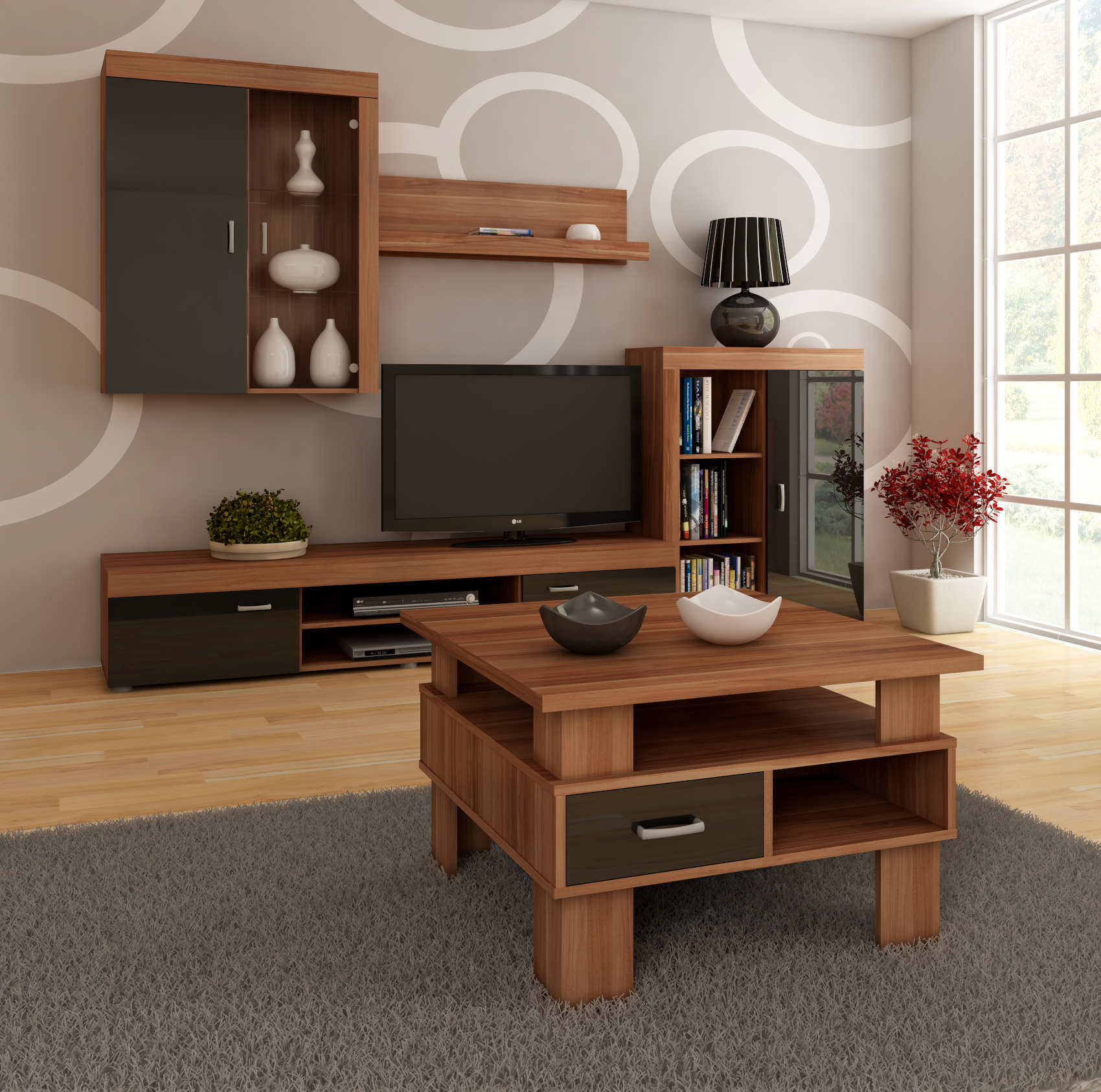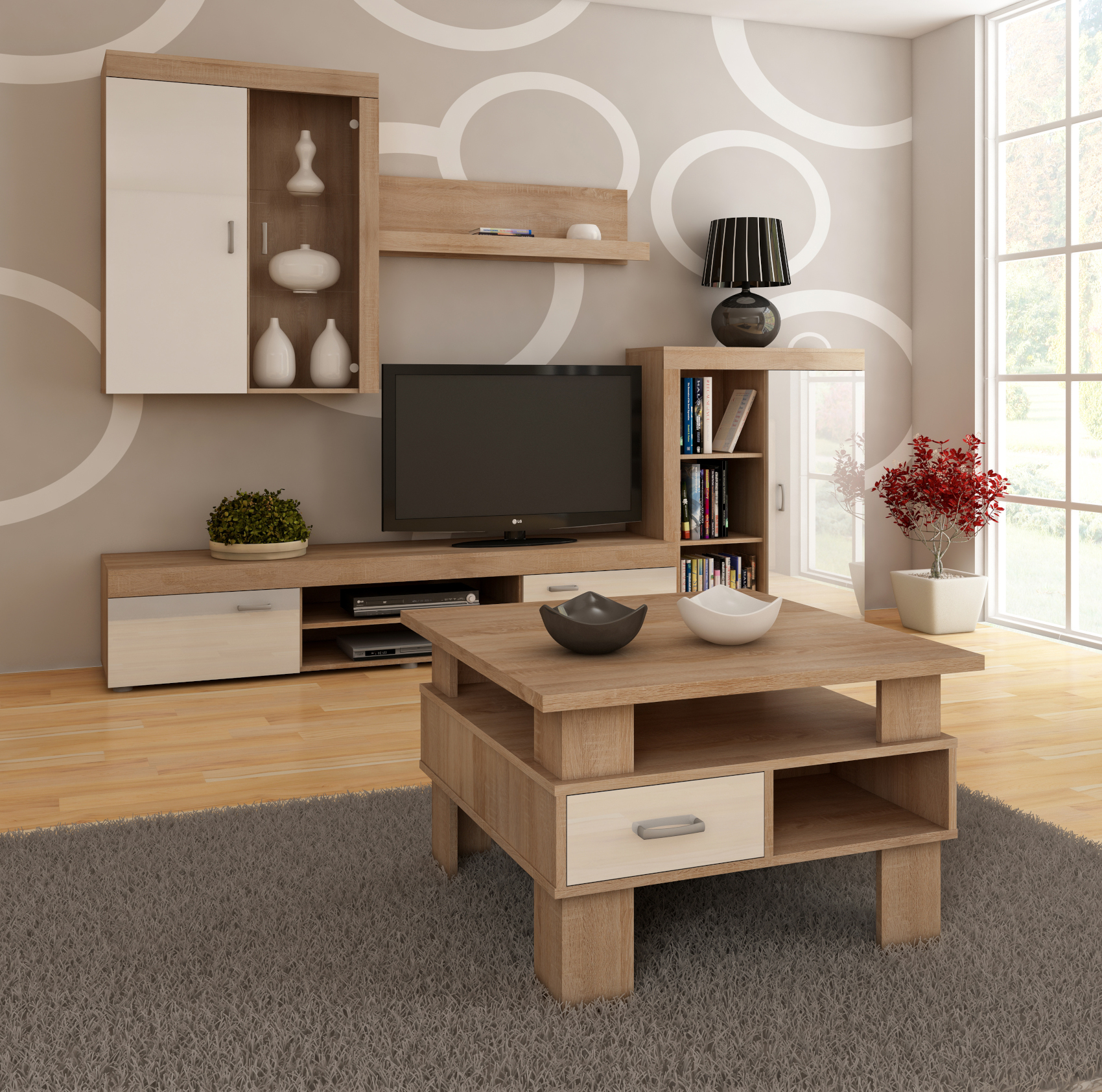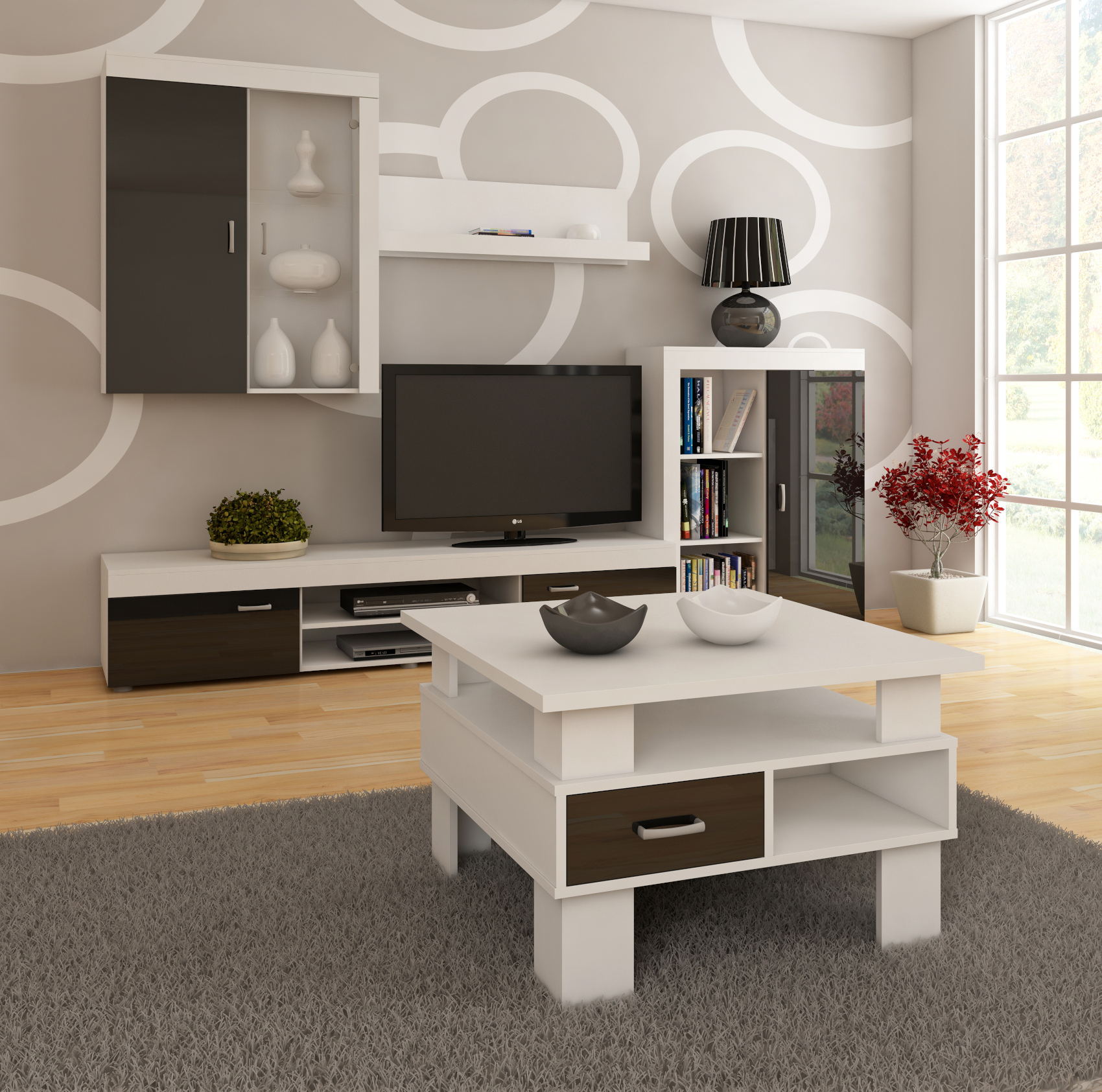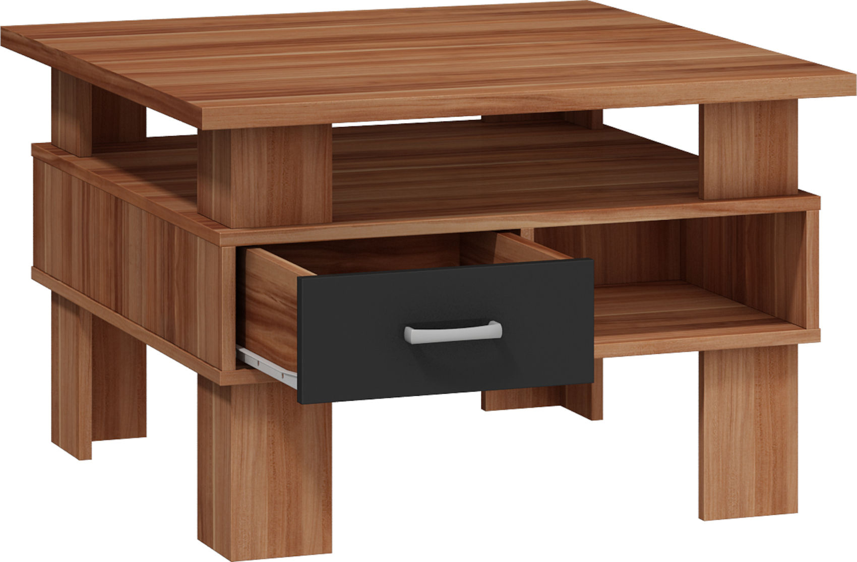 Konferenční stolek Gamma. Stolek má prostornou polici a dvě praktické zásuvky. Je vhodný především do interiérů, kde je kladen důraz na moderní a stylové bydlení. Horní deska je z 25 mm silného lamina, zbytek korpusu z 16 mm lamina. ABS hrany mají sílu 0,6 mm.