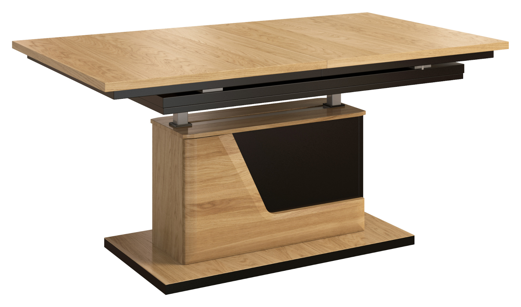 Horní deska je připevněna k pevné a stabilní noze. Díky kovovému kolejnicovému systému můžete stolek rozložit do šířky od 130 cm do 218 cm. Dřevěné nebo skleněné vklady (váš výběr nám prosím napište do poznámky) jsou vloženy pod horní deskou. Pomocí pneumatických pístů s fixací zvednete stůl do výšky od 59 cm do 77 cm. Stolek tak získává charakter jídelního stolu.