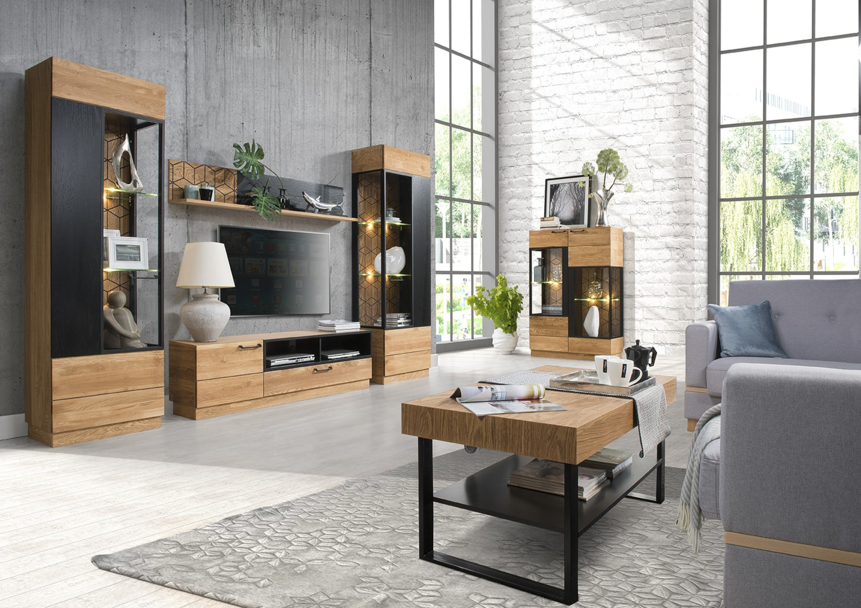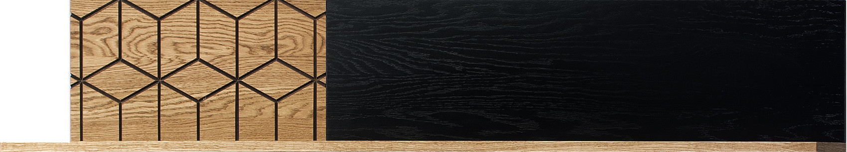 Obývací pokoj Mosaic vás zaujme svým luxusním designem se strukturou přírodního dřeva. Nábytek je vyroben z masivního dubového dřeva a přírodní dubové dýhy. Jedinečnými prvky jsou černé matné lakované detaily na dvířkách a zadních stěnách vitrín. Veškerá dvířka i zásuvky systému Mosaic mají černě matné úchyty.