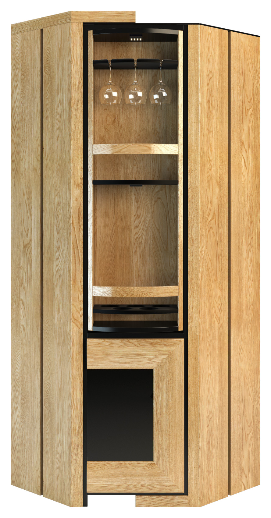 - Otočný rohový bar Corino */**: šířka 76 cm, hloubka 76 cm, výška 193/222 cm