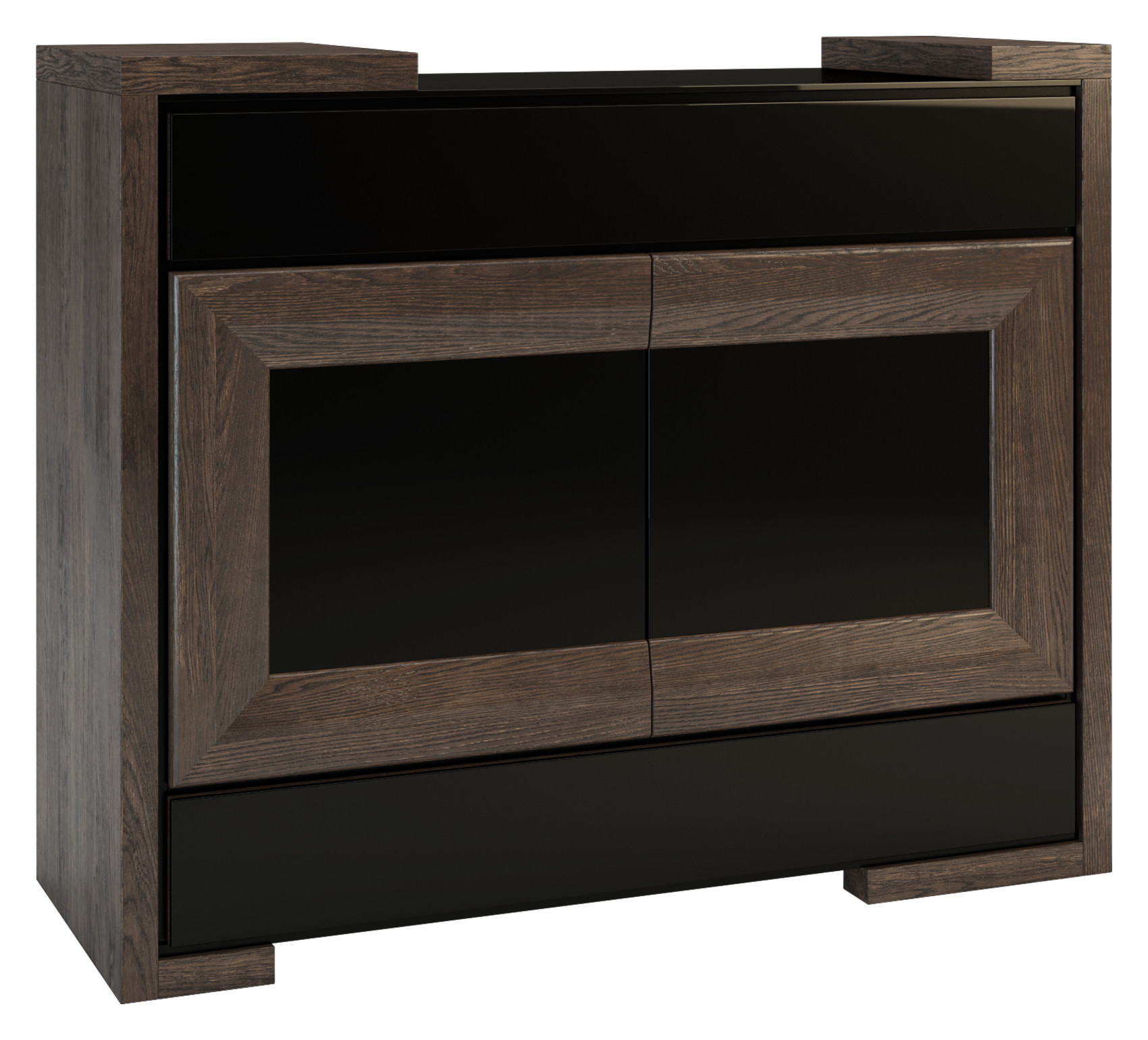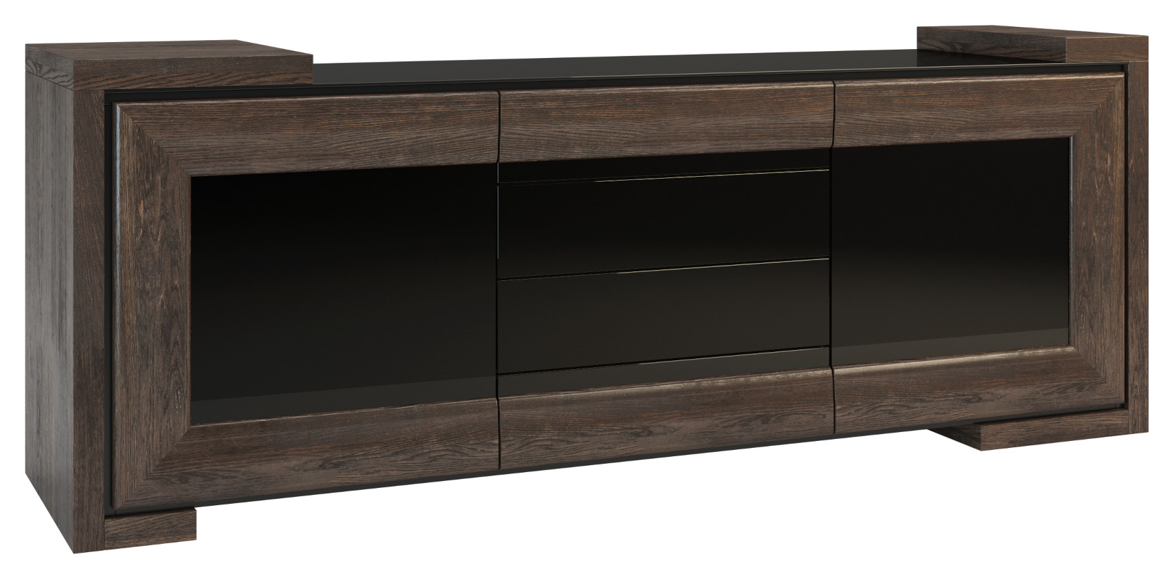 Obývací pokoj Corino vás zaujme moderním a luxusním designem. Jedinečnými prvky jsou přesné geometrické tvary, černé ohraničení nábytku a jeho detaily ze skla Lacobel. Jednotlivé komodity jsou vyrobeny z masivního dubového dřeva, černého skla Lacobel a některé jsou očalouněné potahovou látkou.