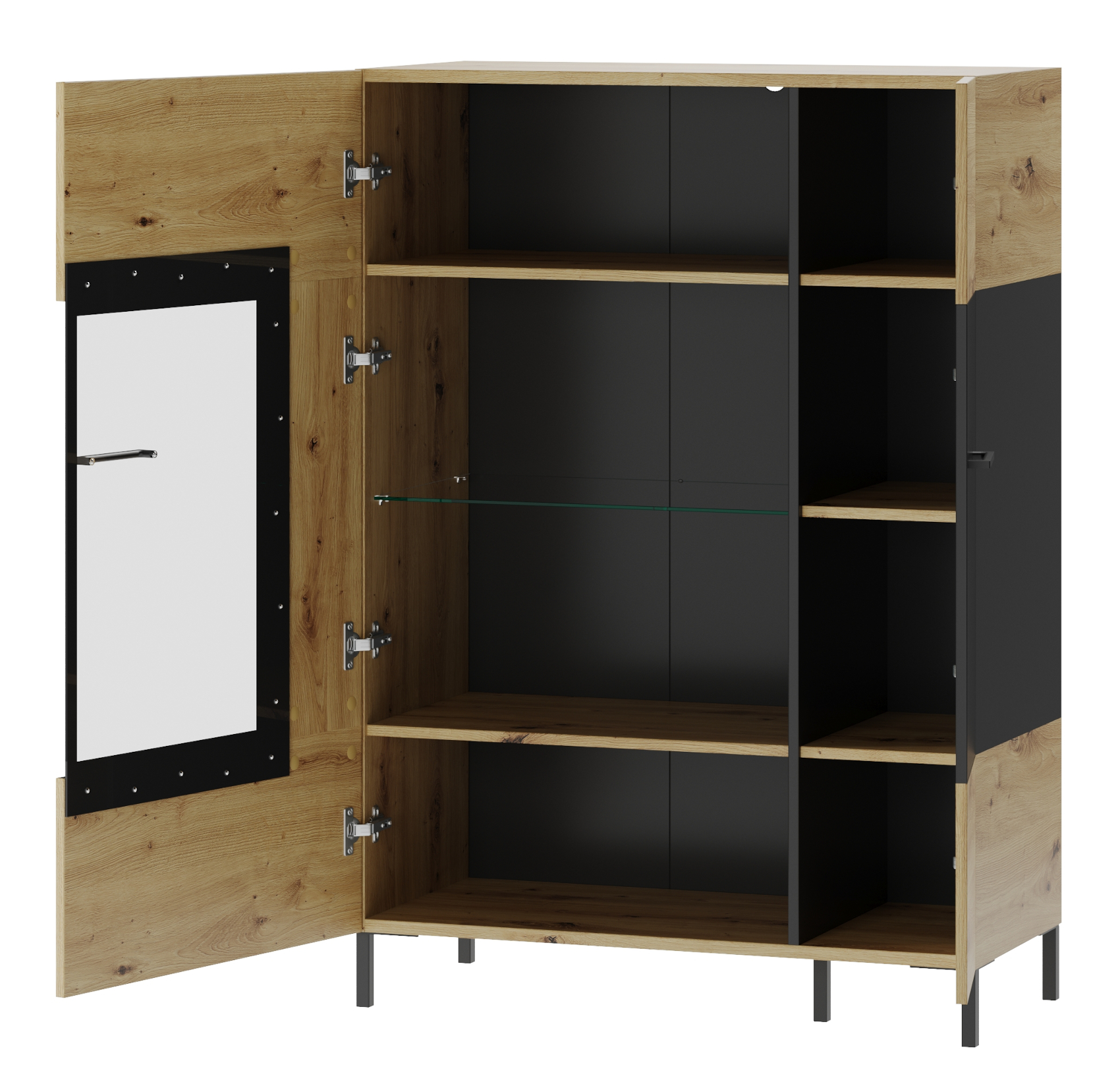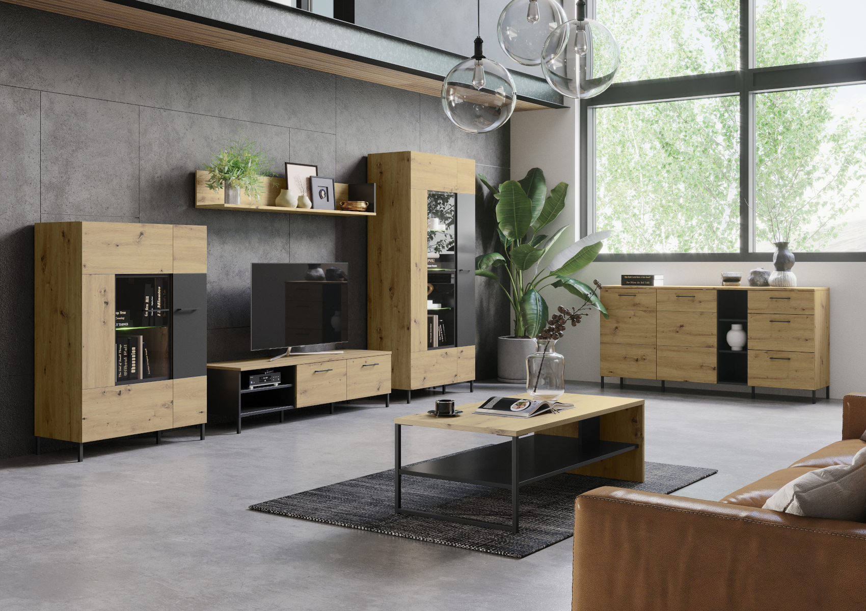 Obývací pokoj Lucas vás zaujme svým luxusním designem se strukturou dřevěných lét. Nábytek je vyroben z lamina potaženého fólií, která navodí dojem přírodního dřeva. Jedinečnými prvky jsou matně černé lakované detaily a černé plastové úchyty. Produkty stojí na černých kovových nožkách, které provzdušní váš celý interiér.