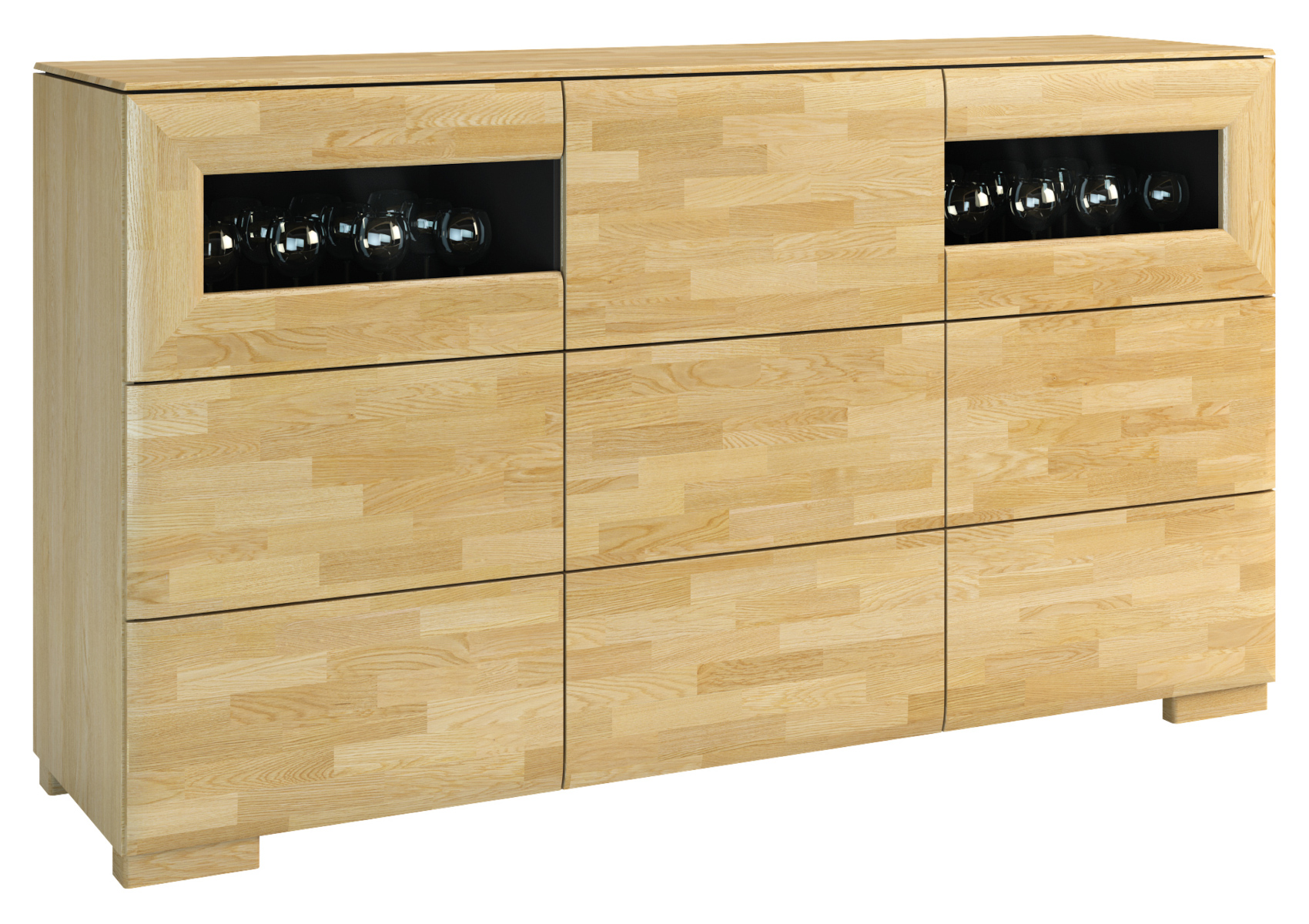 Obývací pokoj Rossano je jedinečný svým moderním a jednoduchým designem. Je vyroben z masivního dubového dřeva s černými lakovanými detaily a ze skla Antisol. U některých z produktů si můžete připlatit za horní desku s masivní dubovou hranou.