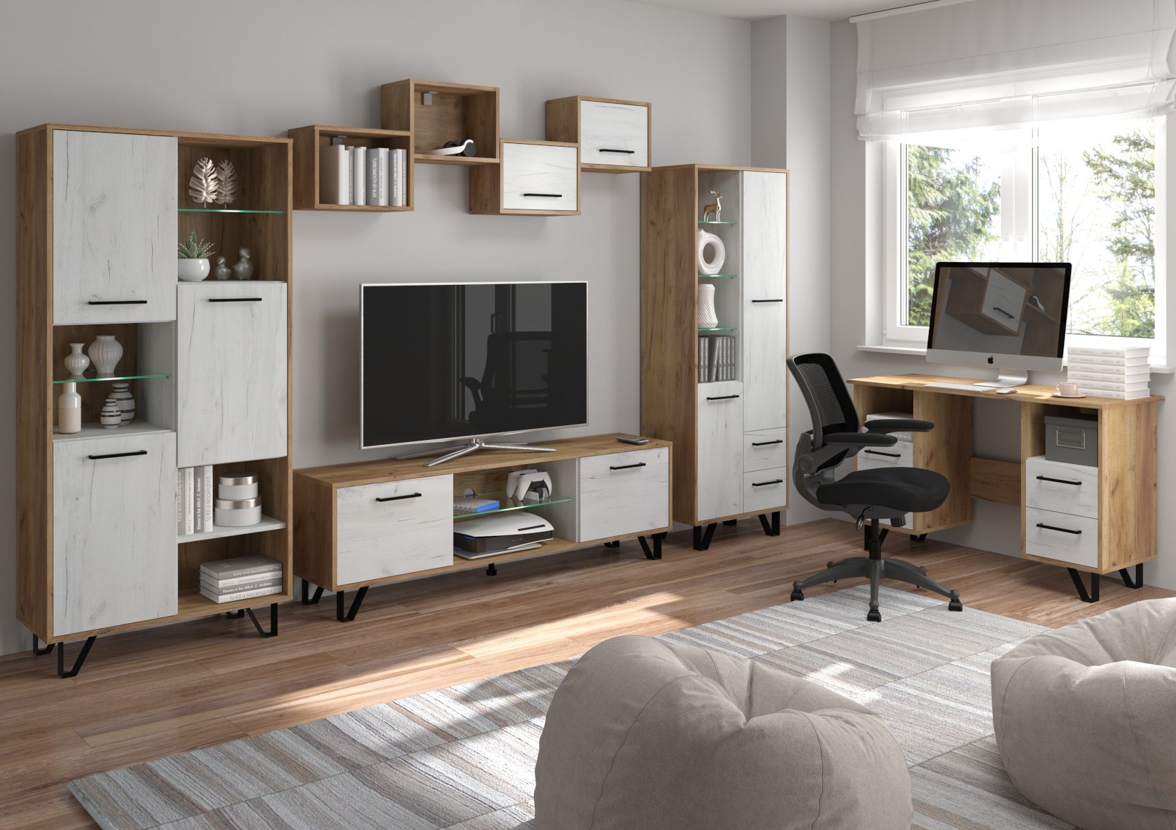 Obývací stěna Boss vás zaujme svým moderním elegantním designem a barevným provedením s přírodními detaily. Jednotlivé komodity jsou vyrobeny z kvalitních lamino desek o síle 16 mm. Desky mají ABS hranění, které zvyšuje odolnost pro odštípnutí hran. Součástí zásuvek a dvířek jsou jednoduché kovové úchyty a zároveň mají zabudovaný systém tichého dovírání. Nábytek stojí na kovových nožkách, které provzdušní váš interiér. Nabízíme vám několik barevných variant.