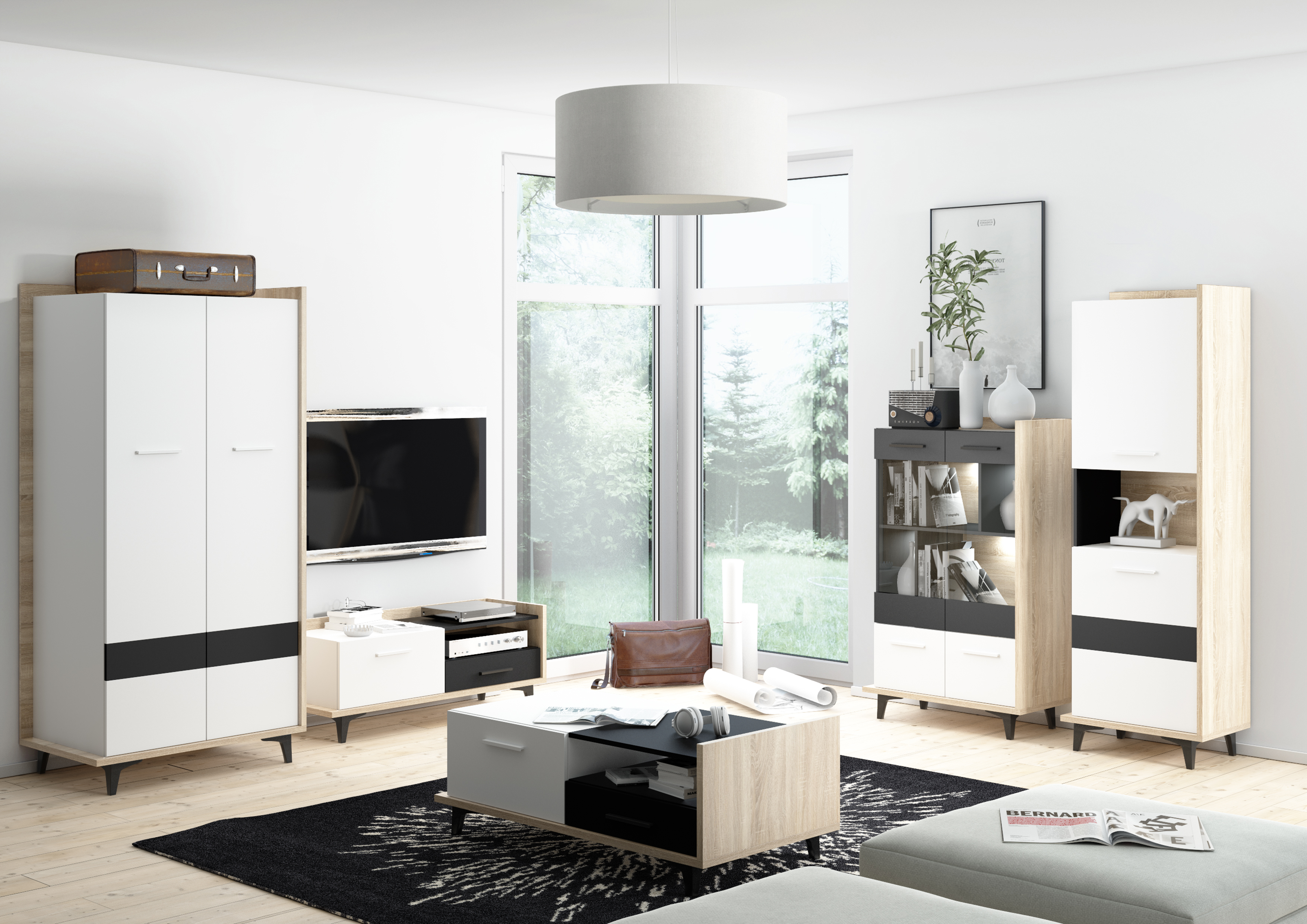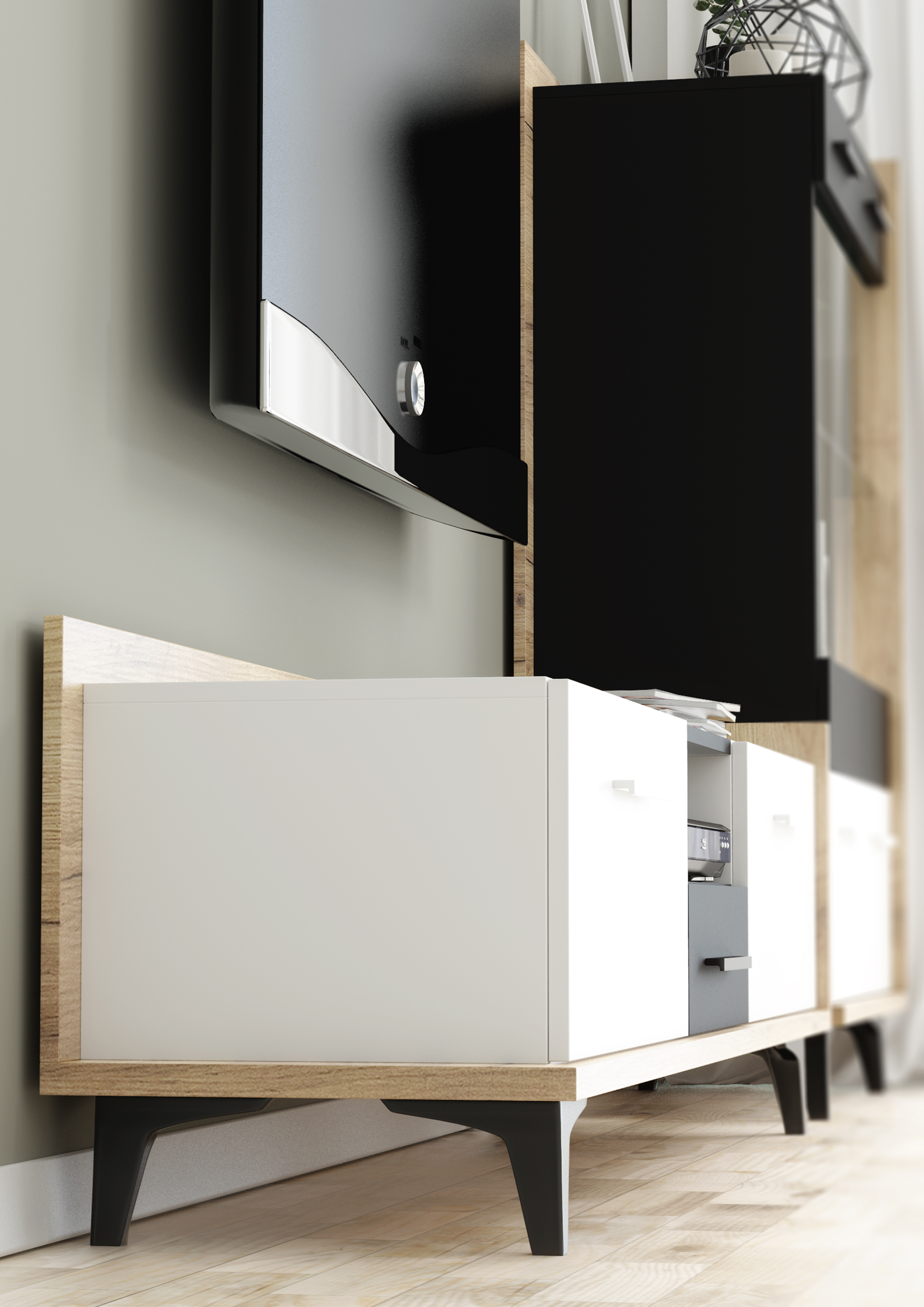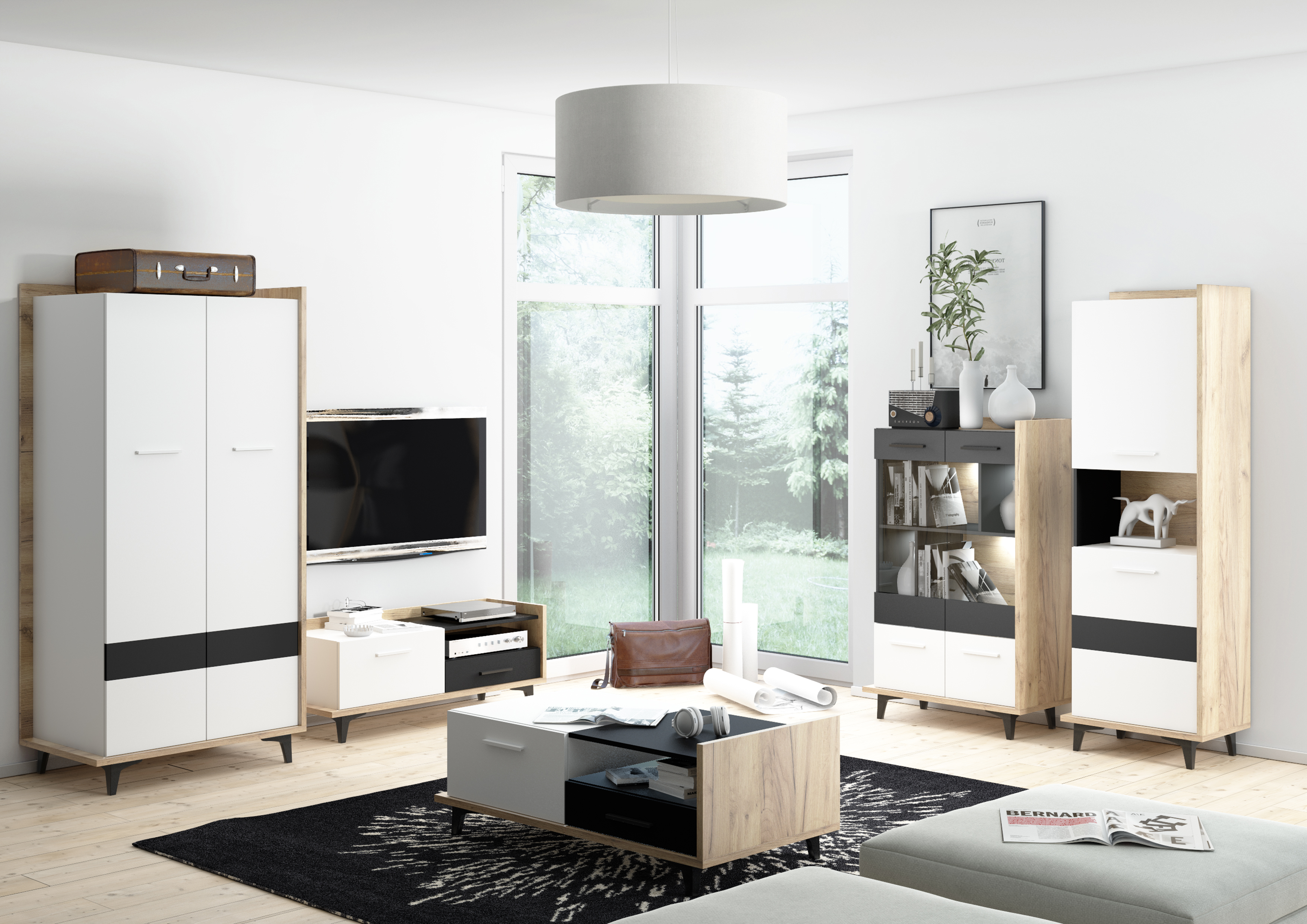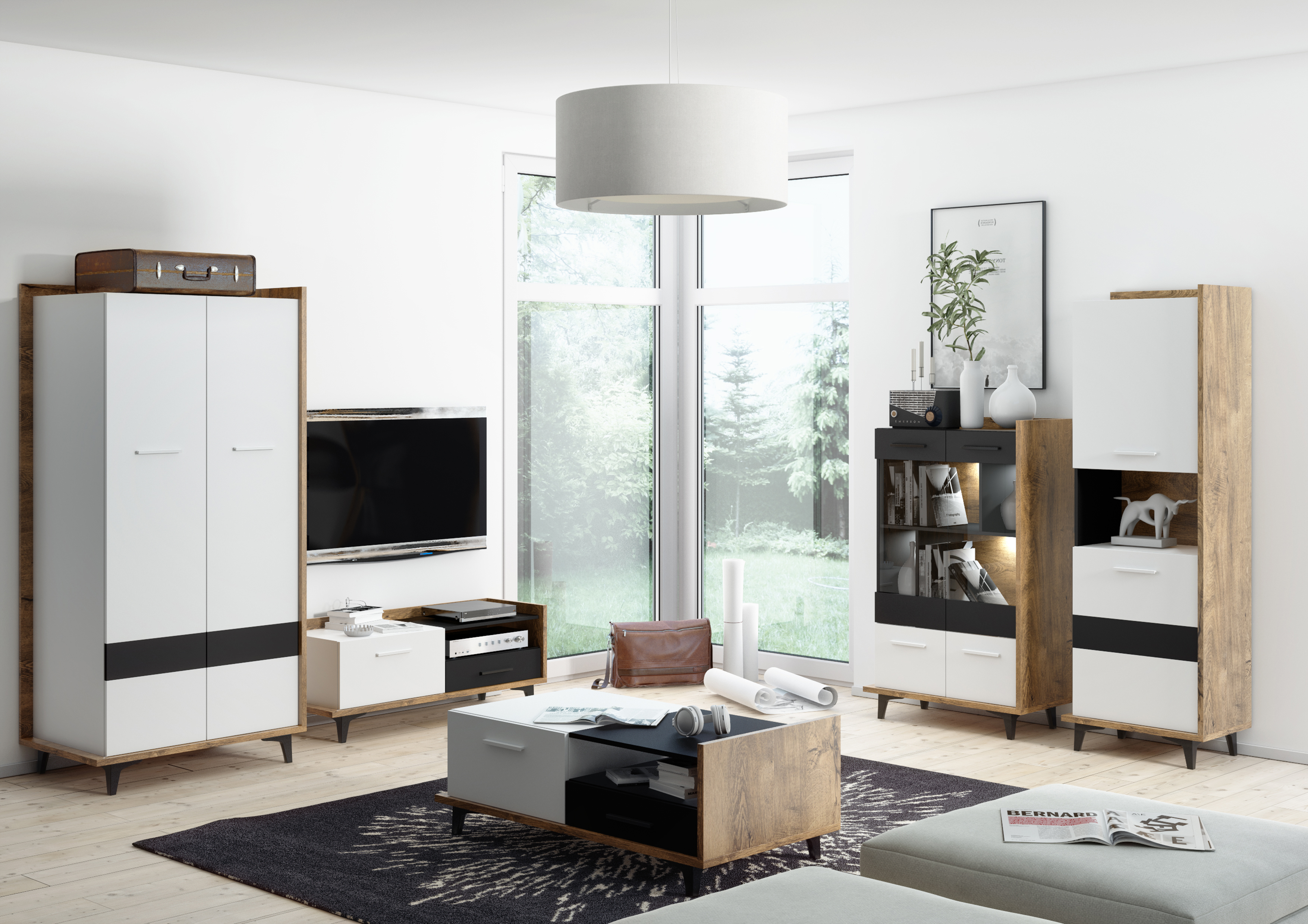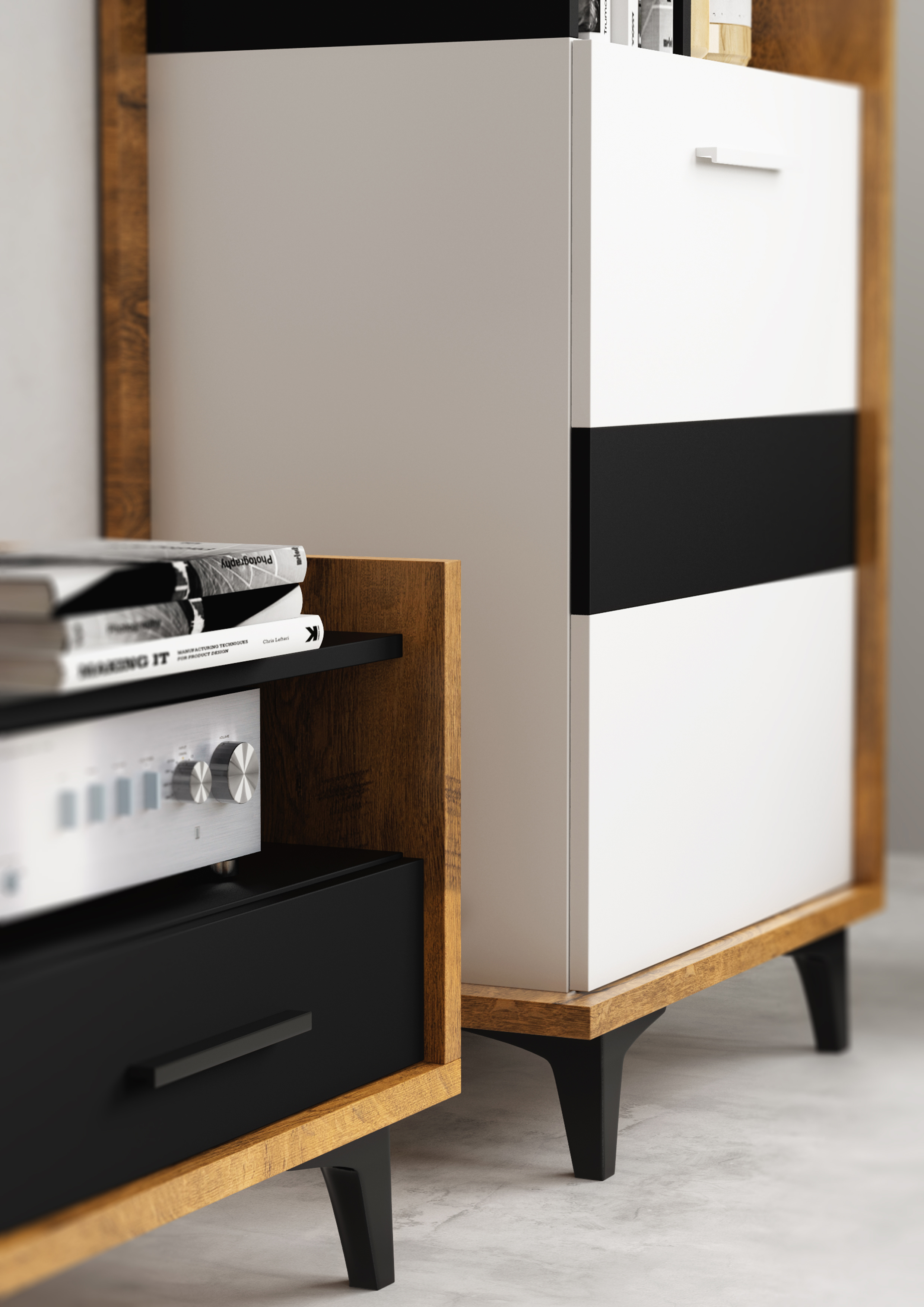 Obývací stěna Box 5 vyniká designem, který je kombinací moderního stylu s retro prvky. LTD materiál, o šířce 16 mm a 25 mm, ze kterého se nábytek skládá, zajišťuje vysokou a špičkovou kvalitu. Desky mají ABS hranění, které zvyšuje odolnost proti odštípnutí hran. Dvířka i zásuvky jsou vybaveny systémem tichého dovírání. Retro nádech kolekci Box dodávají 12 cm vysoké nožky, které nejen dobře vypadají, ale také vám umožní jednoduchý úklid i pod skříňkami. Nabízíme vám výběr z několika moderních dekorů.