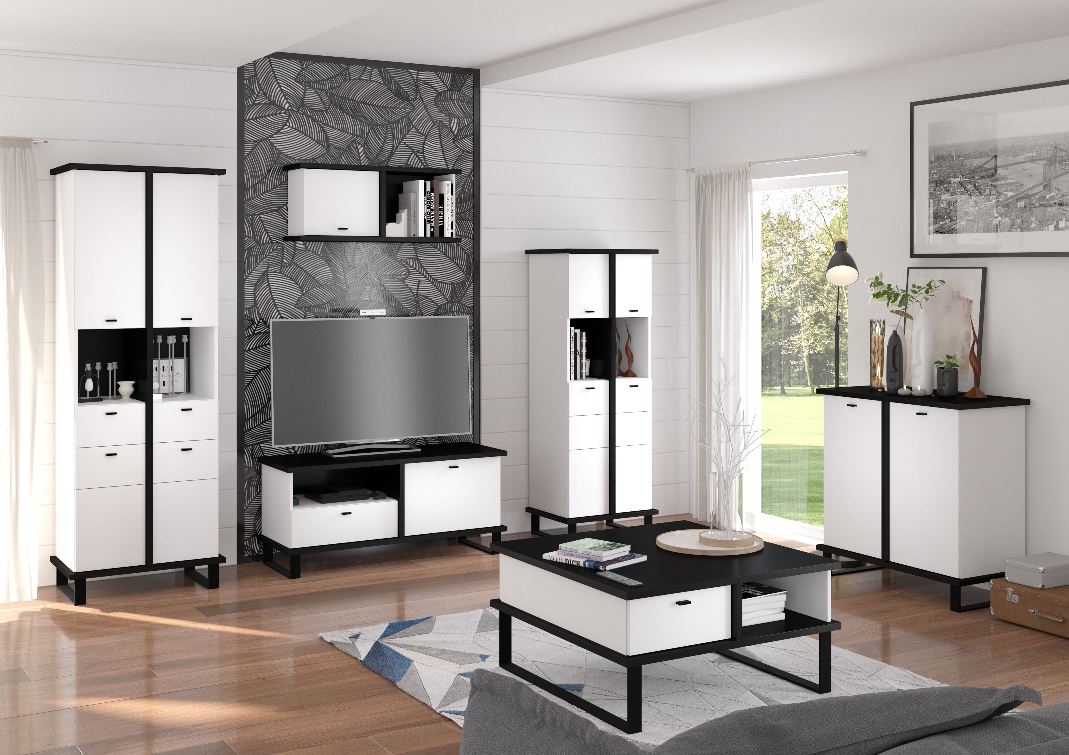 Sestava se skládá z komody Cross 05, úzkého regálu Cross 17, skříňky Cross 18, TV stolku Cross 19 a závěsné skříňky Cross 23 M.