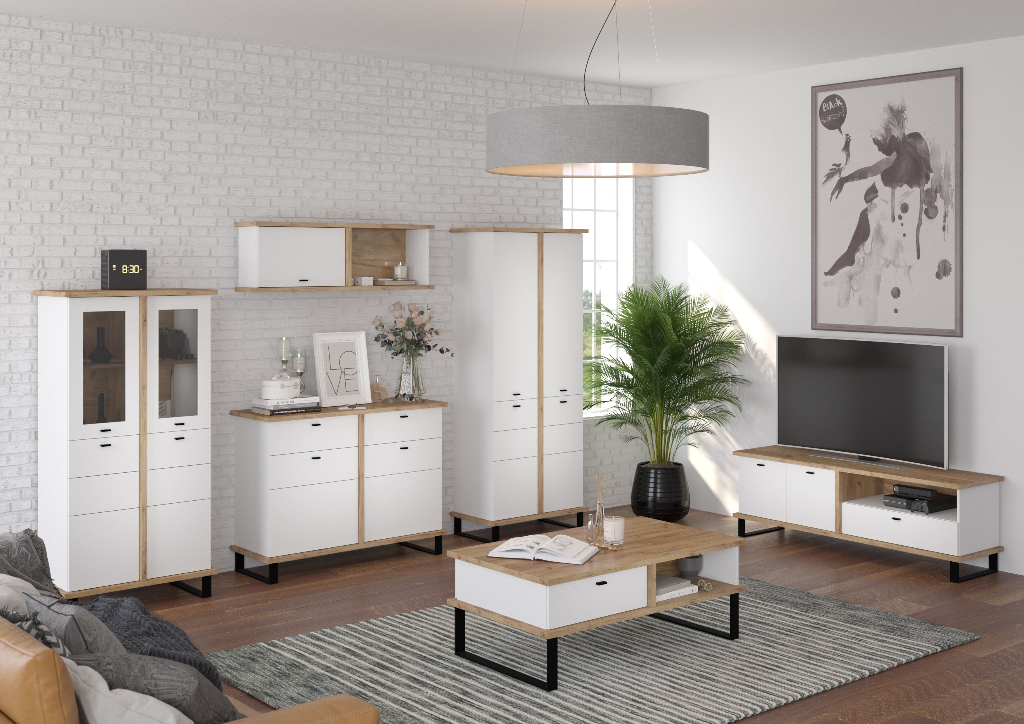 Sestava se skládá ze skříně Cross 01, komody Cross 06, TV stolku Cross 20, závěsné skříňky Cross 24 S a nízké vitríny Cross 25.