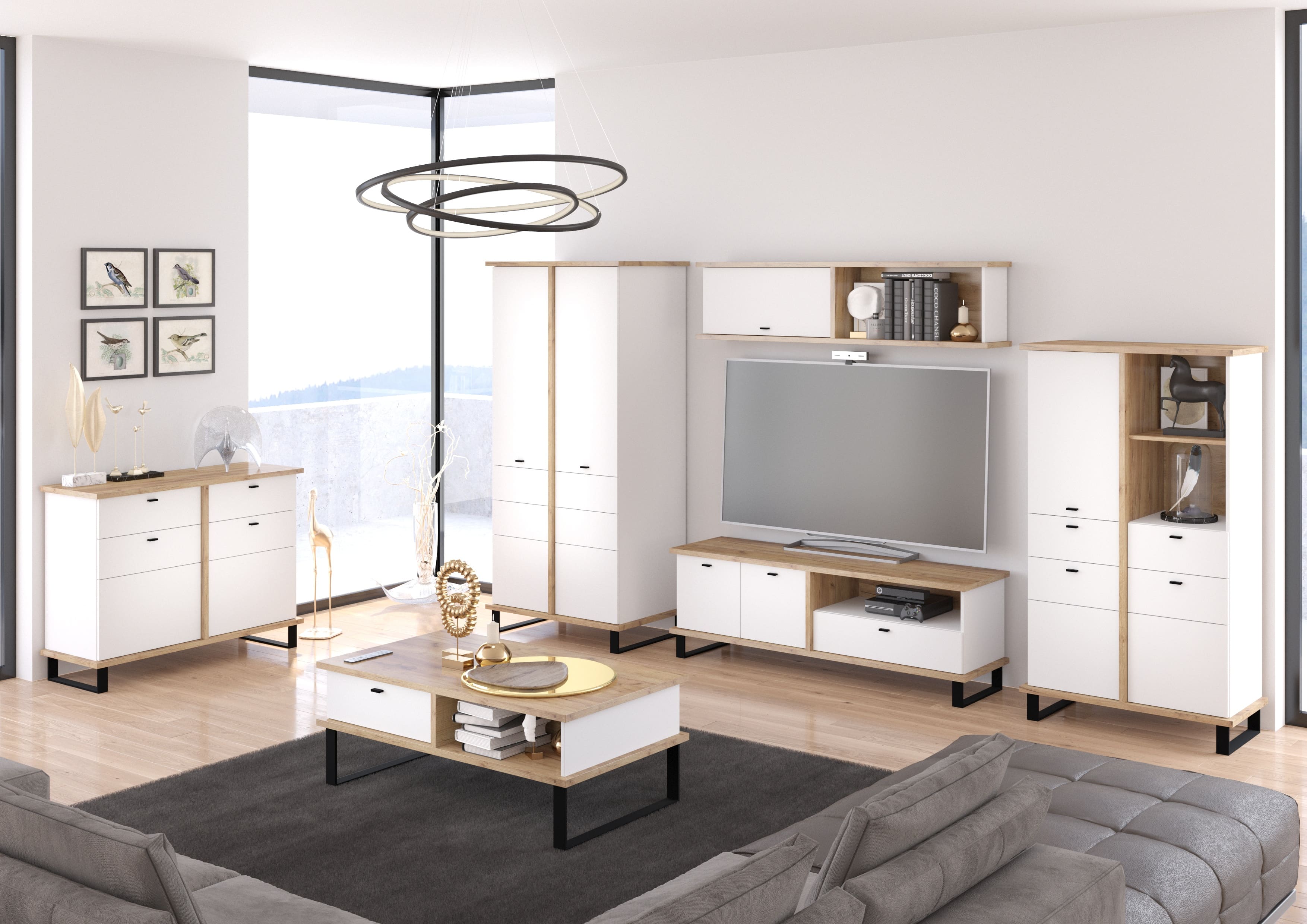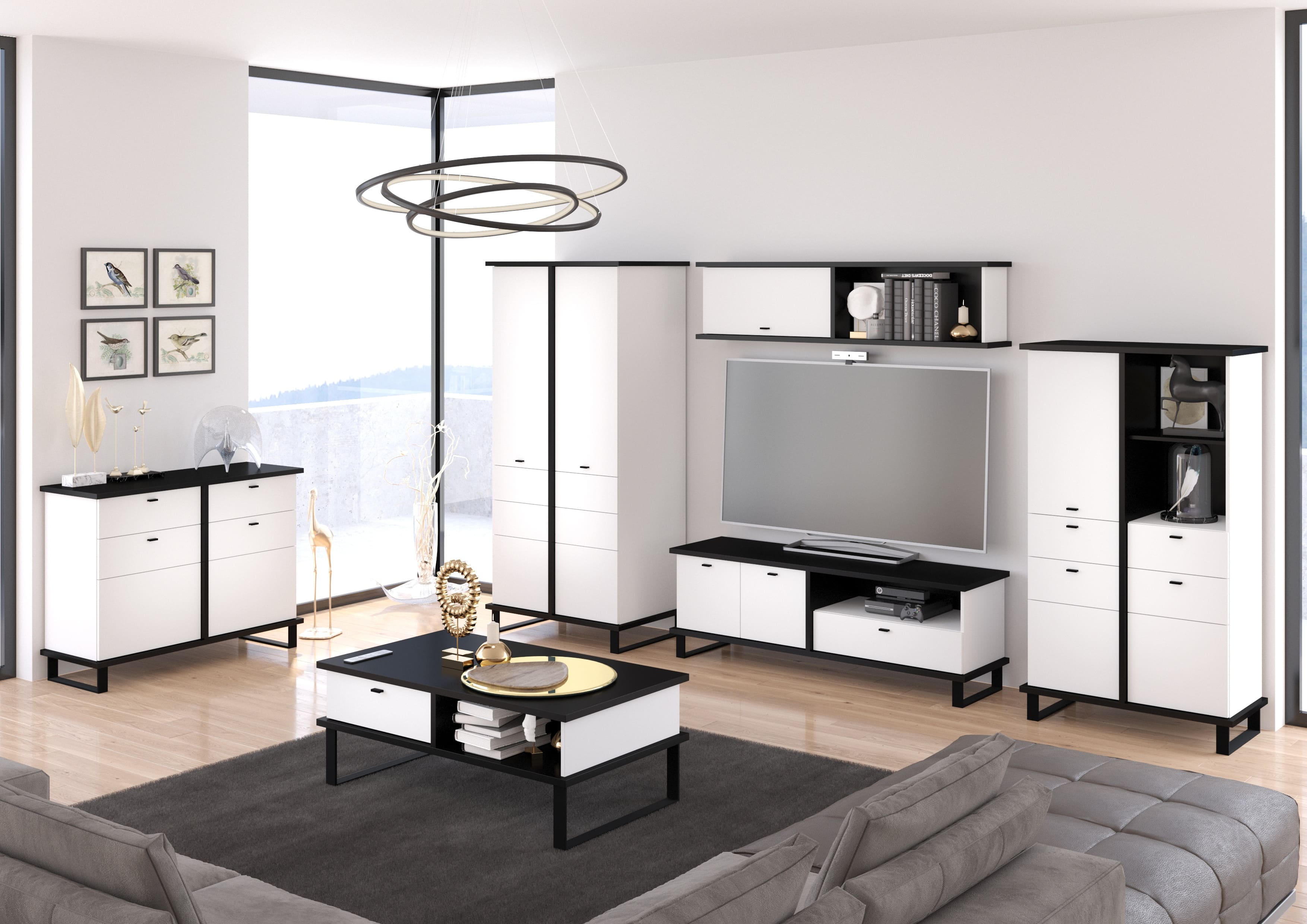 Sestava se skládá z komody Cross 06, nízkého regálu Cross 16, TV stolku Cross 20, šatní skříně Cross 21 a závěsné skříňky Cross 22 D.
