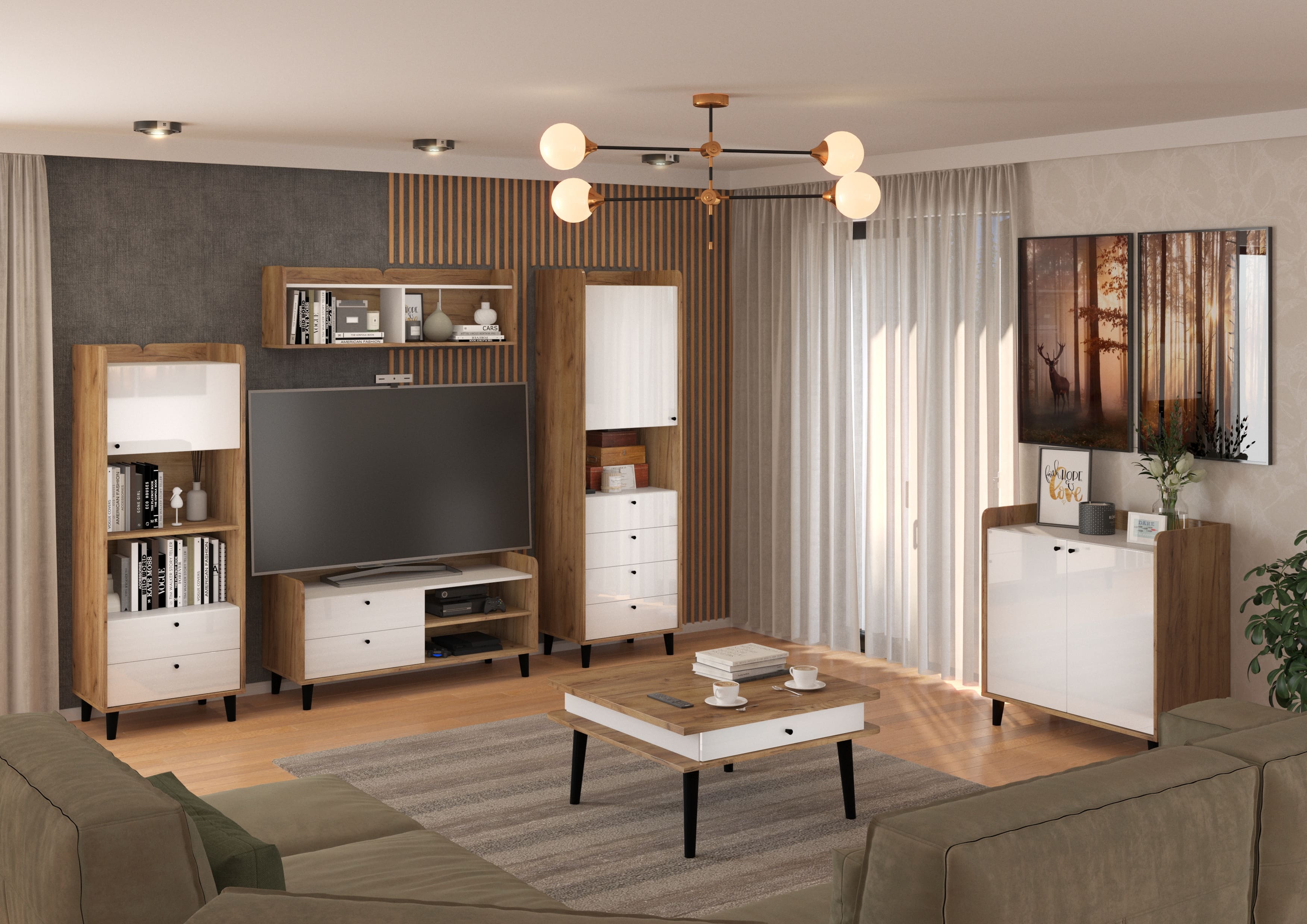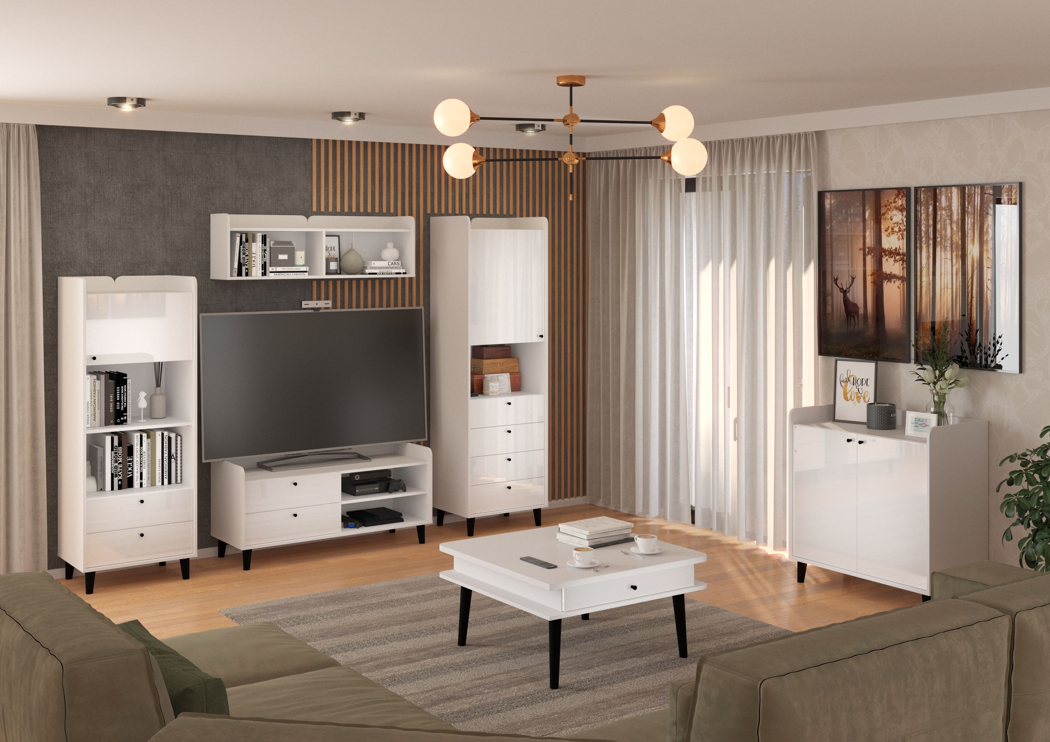Sestava se skládá z komody Dolce 05, police Dolce 12, nízkého regálu Dolce 14, regálu Dolce 15 a TV stolku Dolce 18.