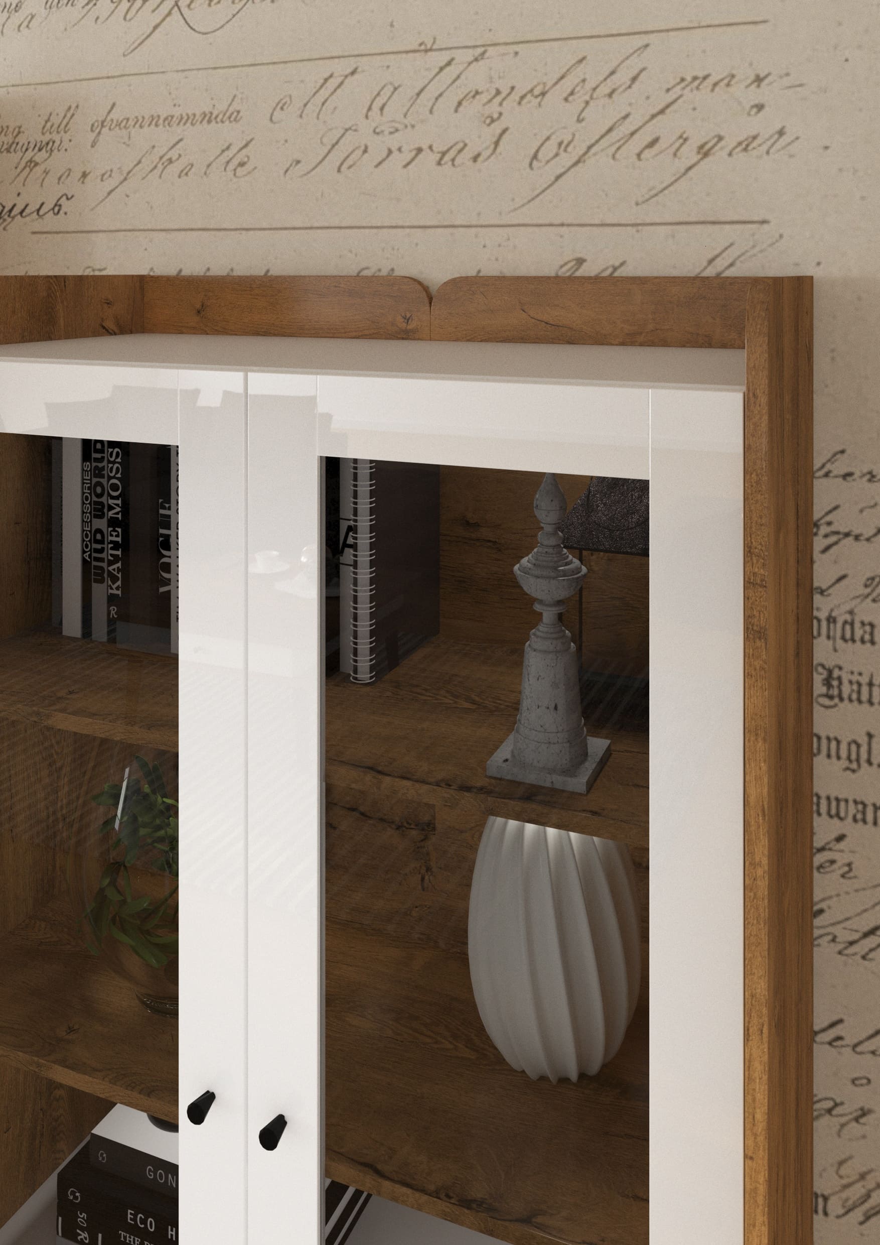 Výrazným prvkem jsou černé dřevěné nožky různých výšek, které dodají celé kolekci originální vzhled. A nejen to, vyšší nožky jsou také praktické při uklízení. Vitríny jsou vybavené kouřovými skly, které ještě více zdůrazní originální vzhled systému. Černou barvu mají i úchyty a spolu s bílým leskem na předních plochách skvěle doplňují dřevodekory reflektující moderní trendy v bydlení. S kolekcí Dolce nemůžete šlápnout vedle!
