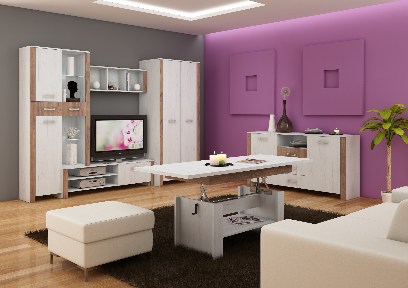 Ke stěně si můžete také doobjednat vyobrazený konferenční stolek Mexico a komodu Hugo 02, které nejsou součástí naceněné sestavy.