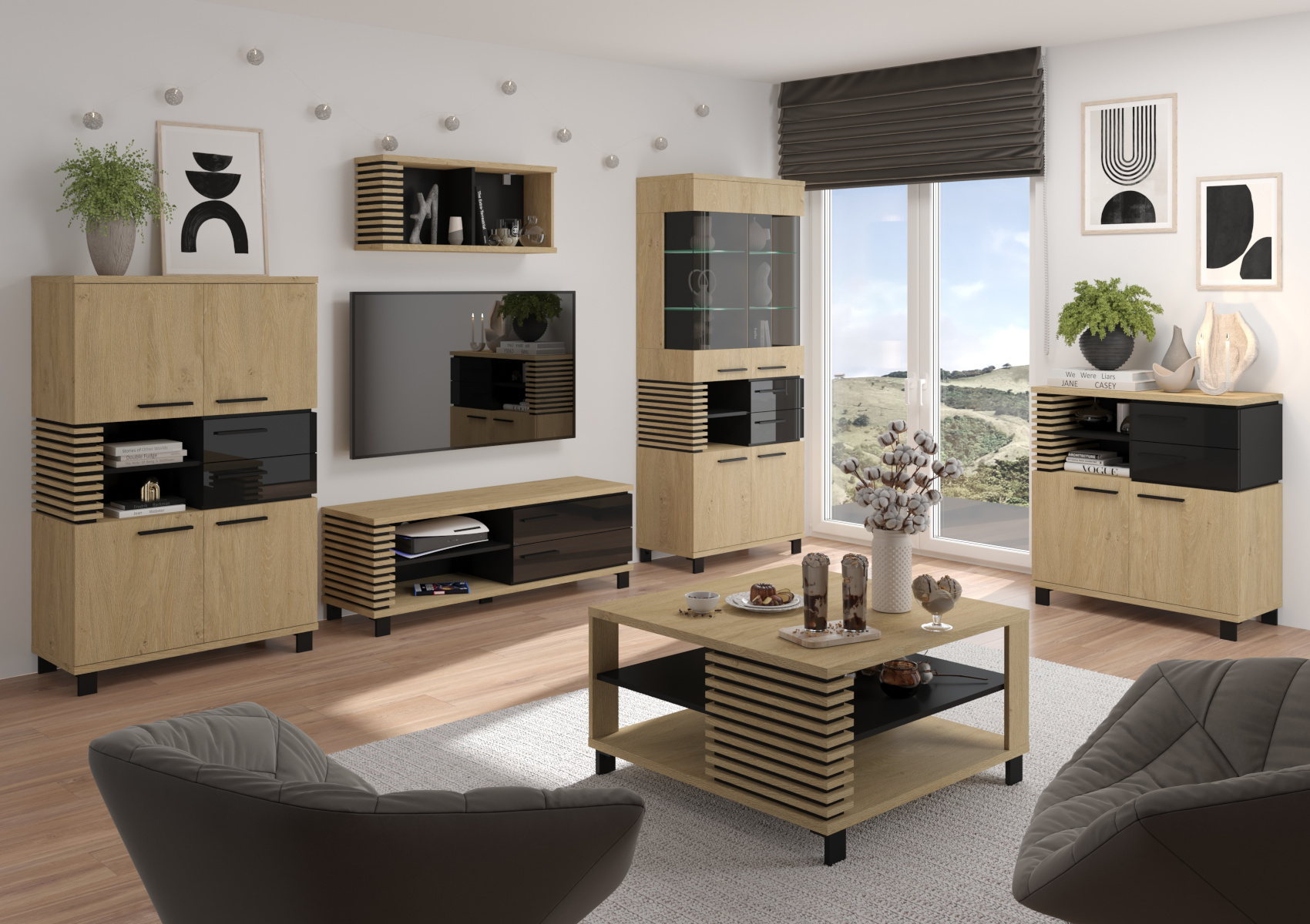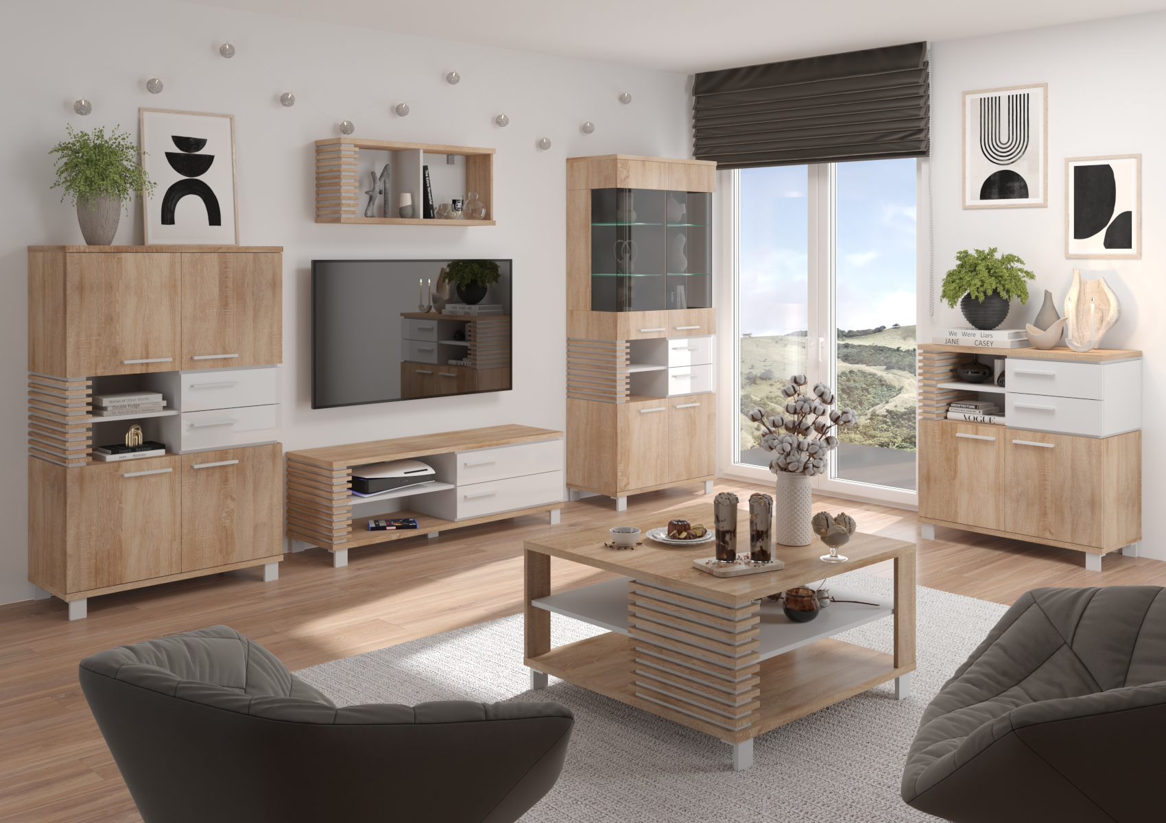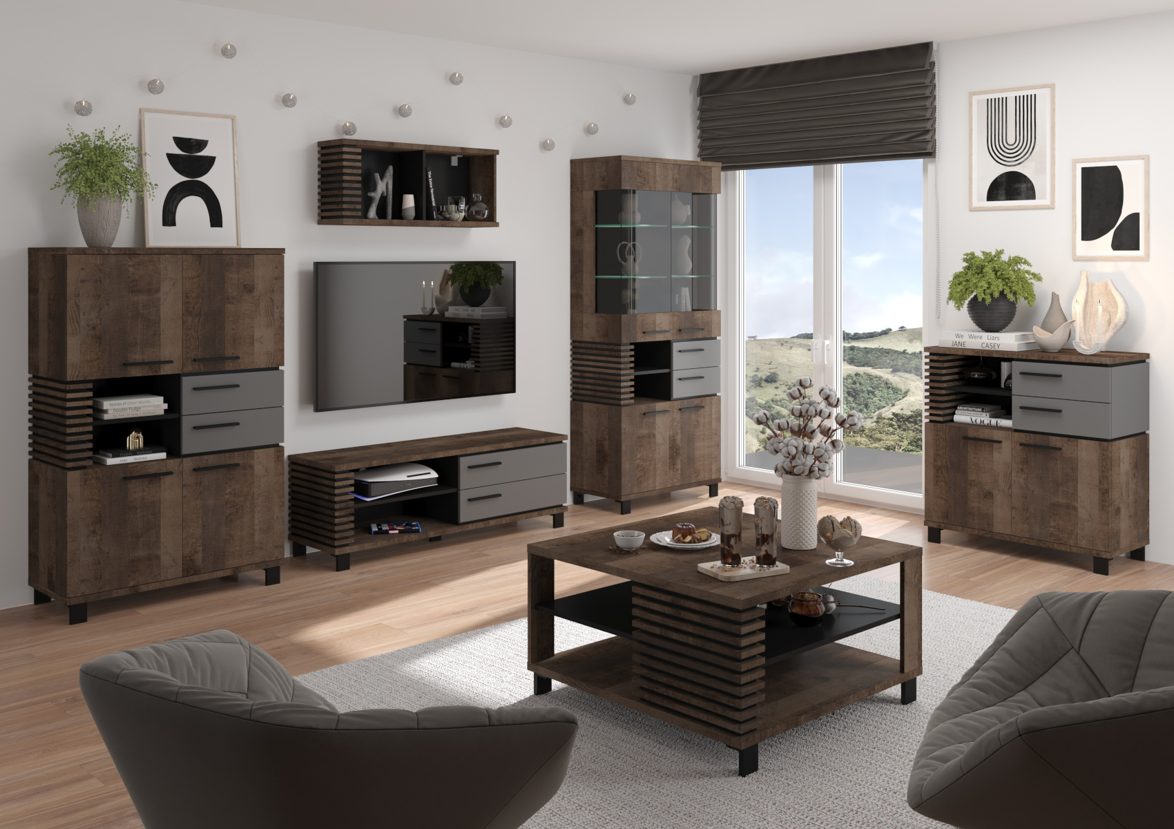 Obývací stěna je sestavena z jednotlivých komodit systému Lamir, ze kterých si vytvoříte svůj vysněný obývací pokoj, relaxační místnost či pracovnu.