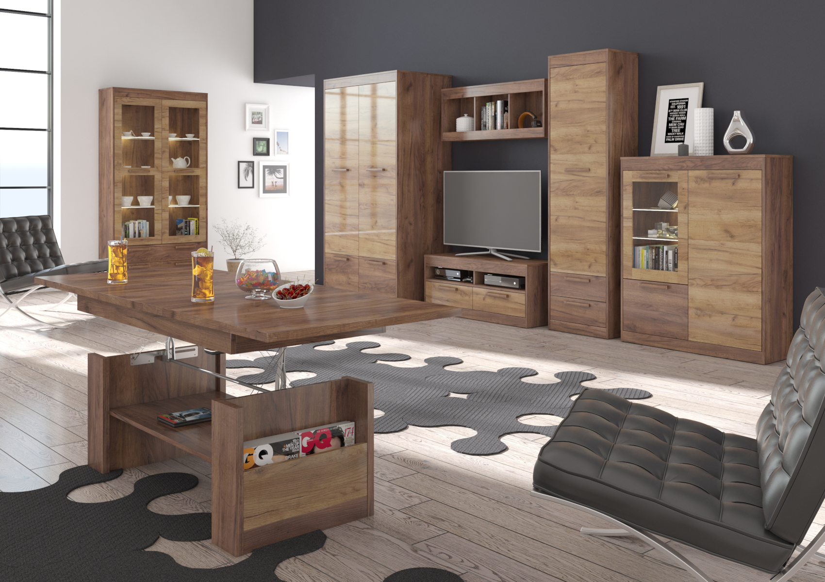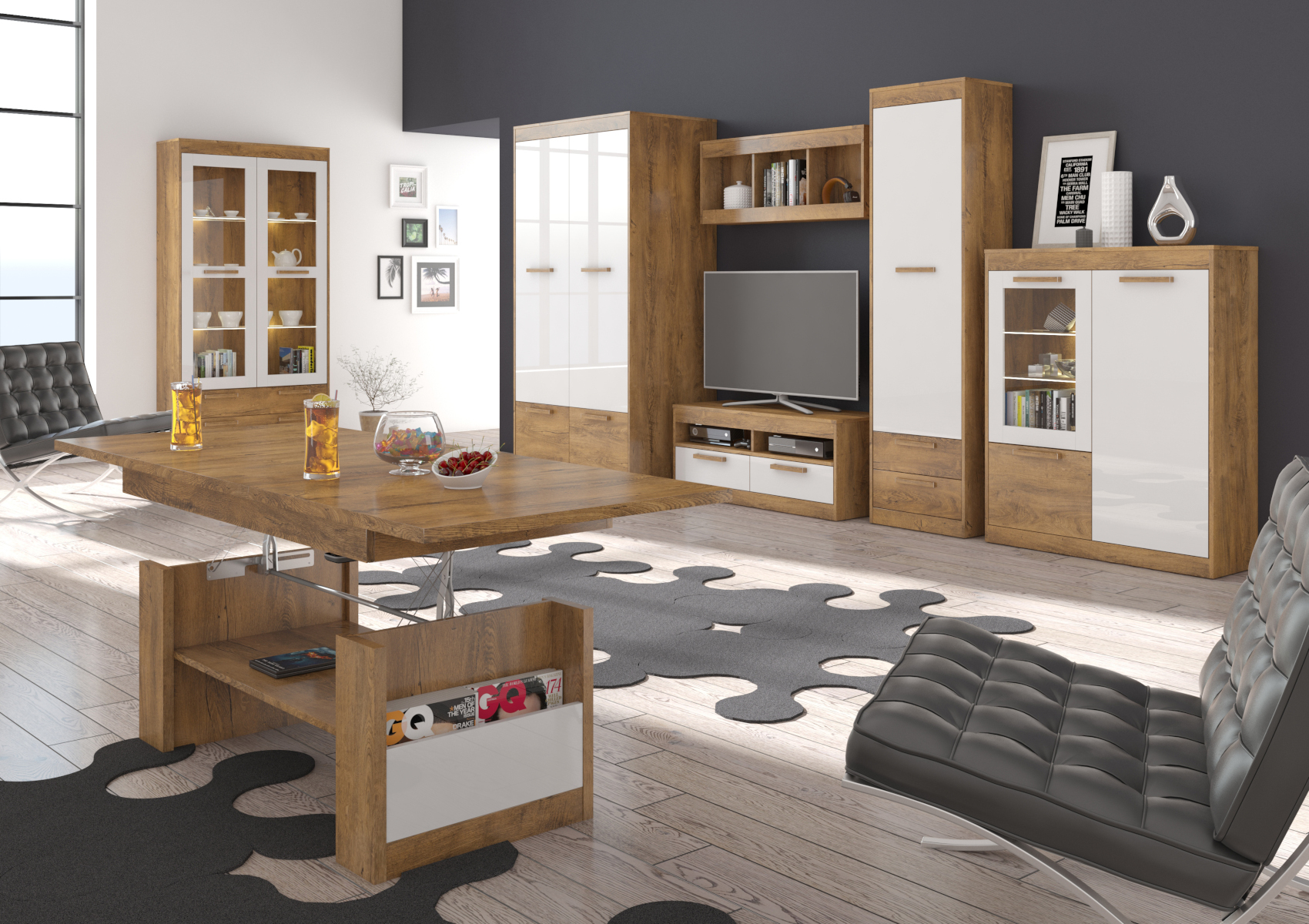 Můžete si k ní také dokoupit vitrínu 2S Maximus a konferenční stolek R Maximus, který je skvělým pomocníkem při oslavách, protože díky jeho možnosti zvýšení desky, lze komfortně pohostit hosty i u konferenčního stolku.