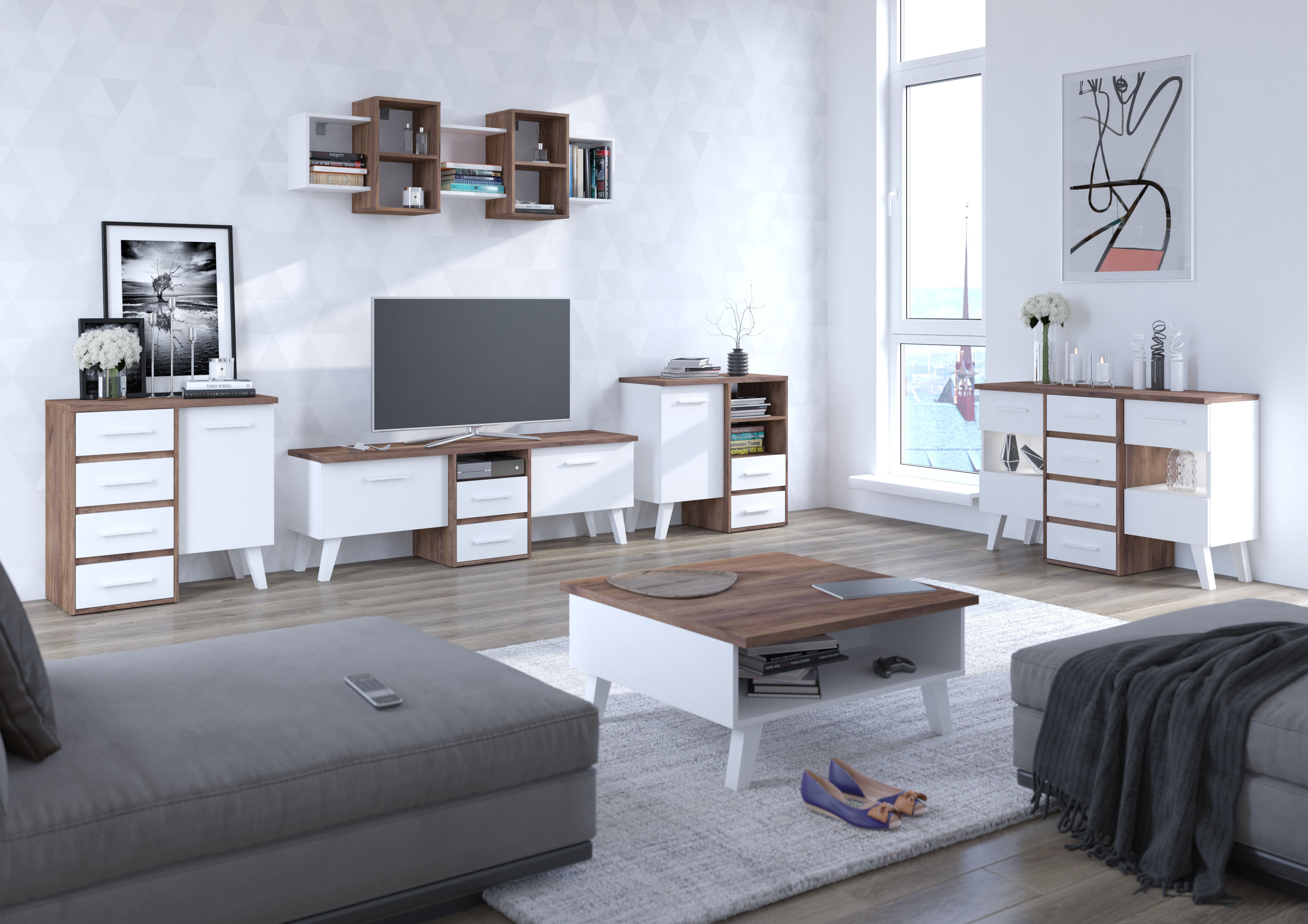 Stěna se skládá z komody Nordis 02, komody Nordis 03, univerzální police Nordis 08 a TV stolku Nordis 13.