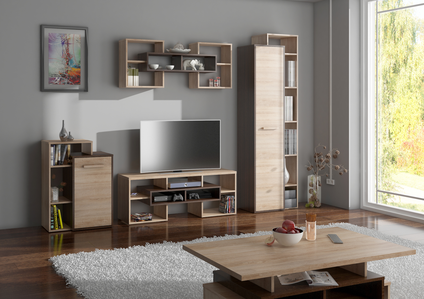 Obývací stěna Rio 1 nabízí - skříň P Rio 02, komoda L1D Rio 08, konferenční stolek S Rio 12, TV stolek Rio 20.